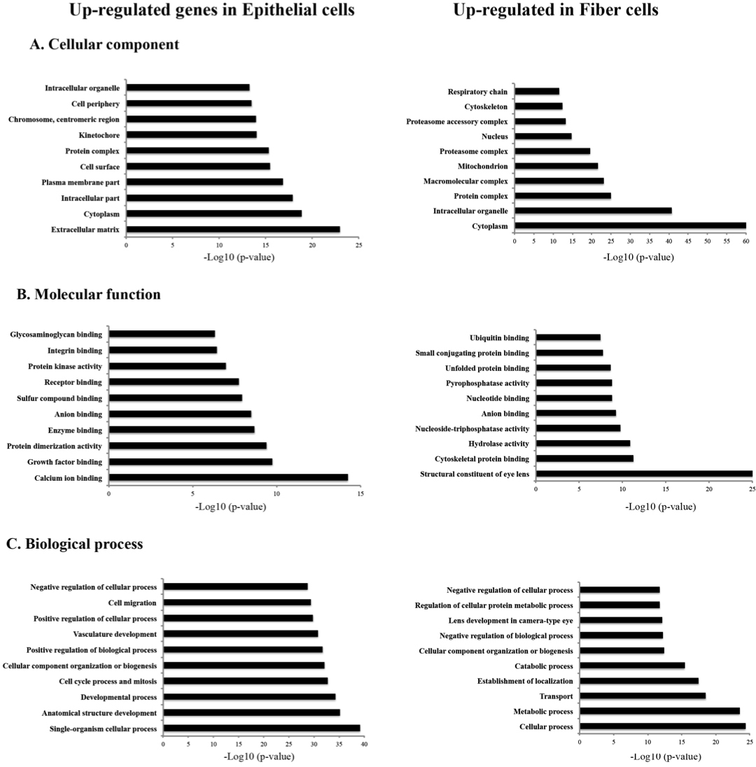 Figure 5. Gene Ontology enrichment analysis for genes upregulated in epithelial and genes upregulated in fiber cells. The top ten most