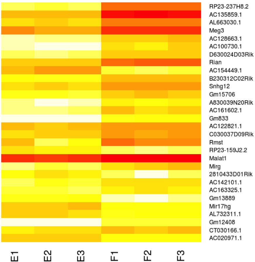 Figure 6. Top 30 most significantly differentially expressed lincRNAs between the epithelial and fiber cells ranked by adjusted p value.