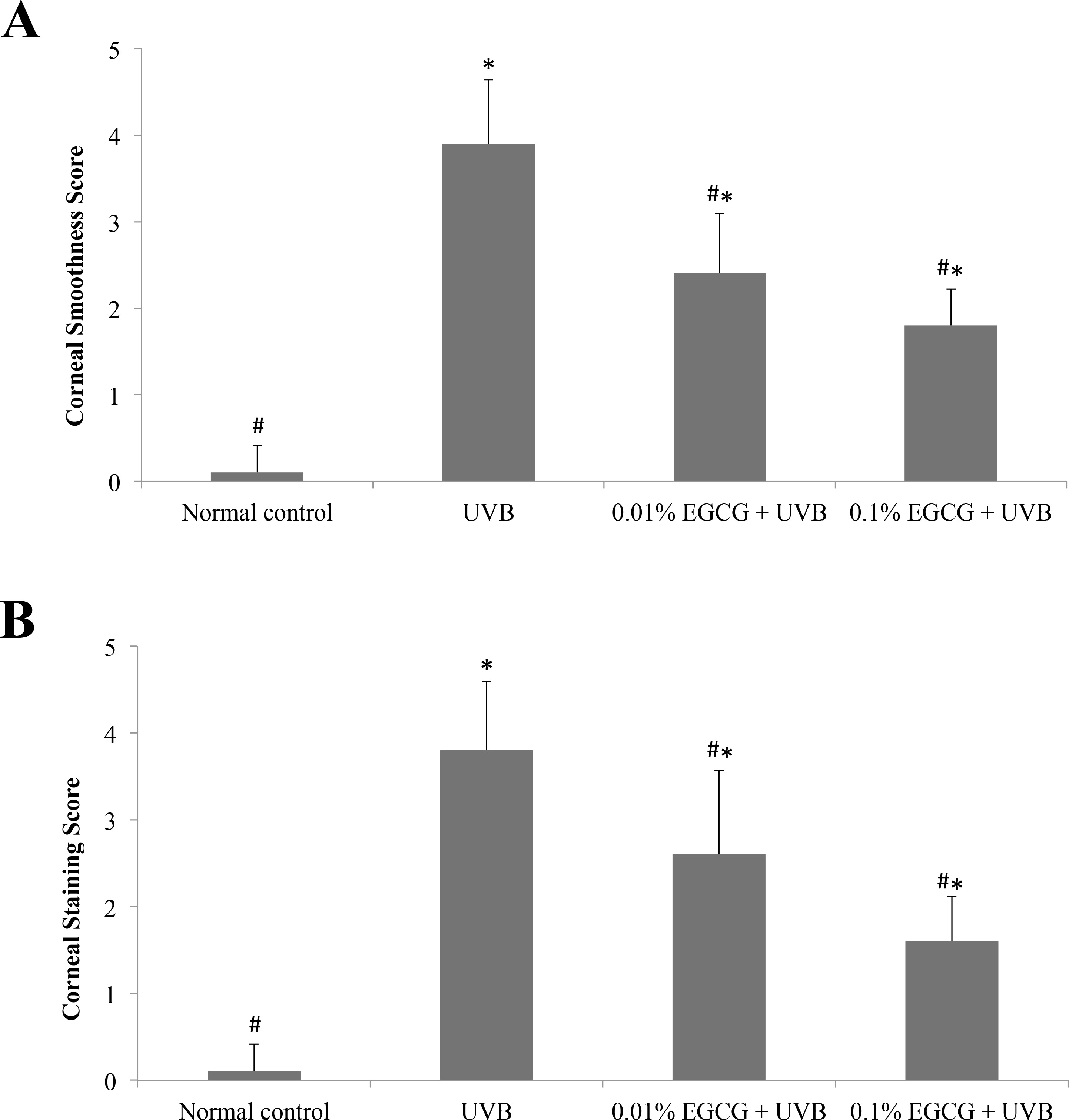 mire grade (A) and the lissamine green staining index (B) in ultraviolet B (UVB)-induced corneal oxidative damage in mice. * p<0.05 compared with the normal control. # p<0.05 compared