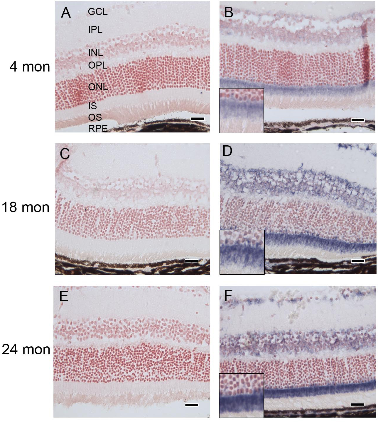 miR-34a expression at 4 (B), 18 (D), and 24 months (F) of age. MiR-34a labeling is blue/purple, and the nuclear counterstain is pink. At 4 months (B), miR-34a expression is localized in the inner segments (IS) and scarcely in the outer nuclear layer (ONL; see inset) of