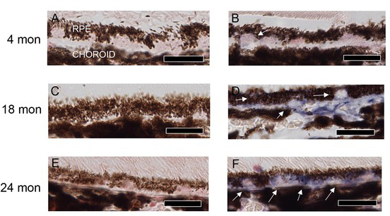 (B), barely perceptible miR-34a expression is seen in the cytoplasm of the RPE cells. By 18 months (D), expression is much more visible and still in the cytoplasm. At 24 months (F), miR-34a expression is visibly pronounced and remains cytoplasmic. Scale bar=20 μm.