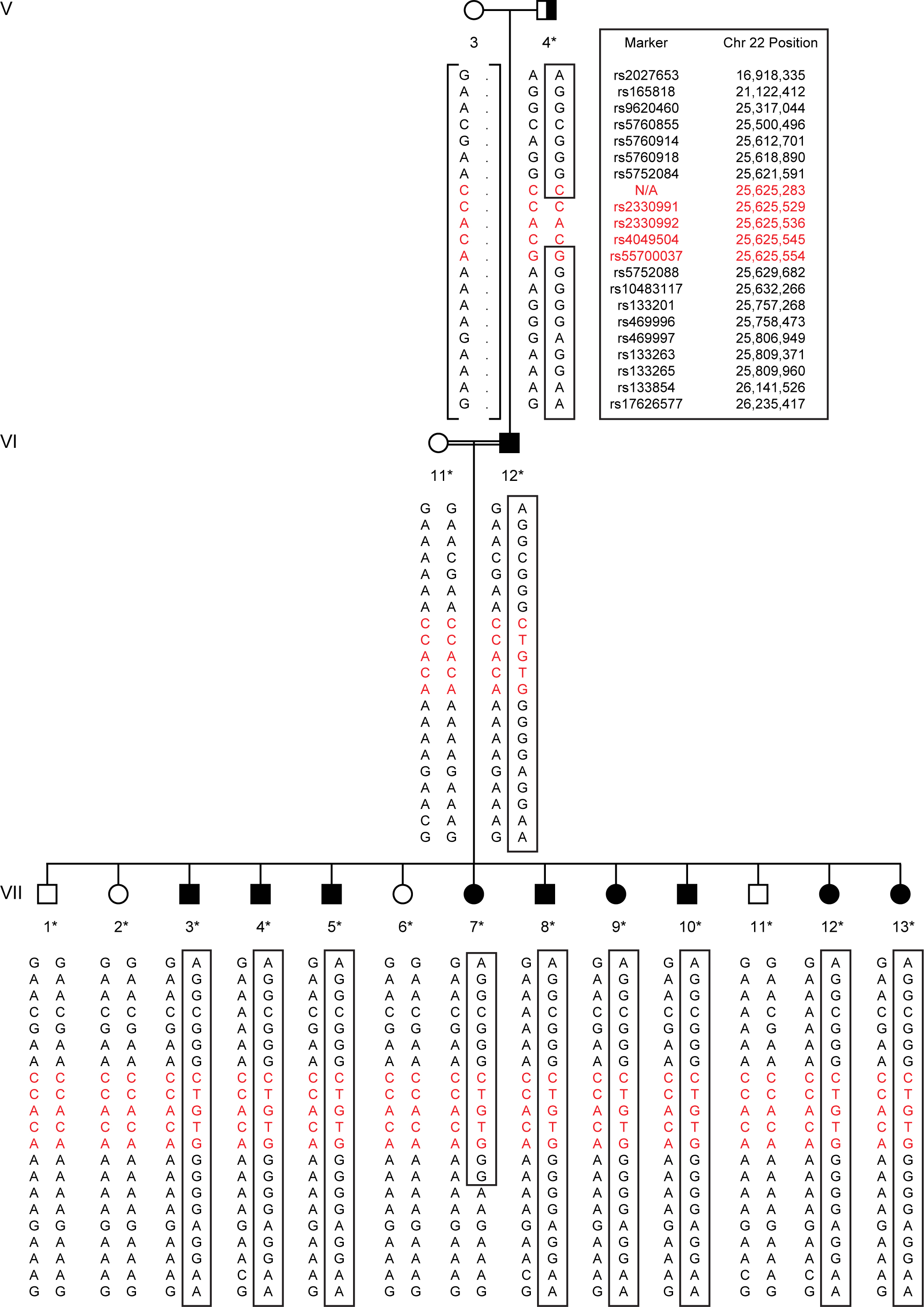 Figure 1. The inferred haplotype is shown for V:3 (not genotyped). More than 100 markers were analyzed to generate these haplotypes.