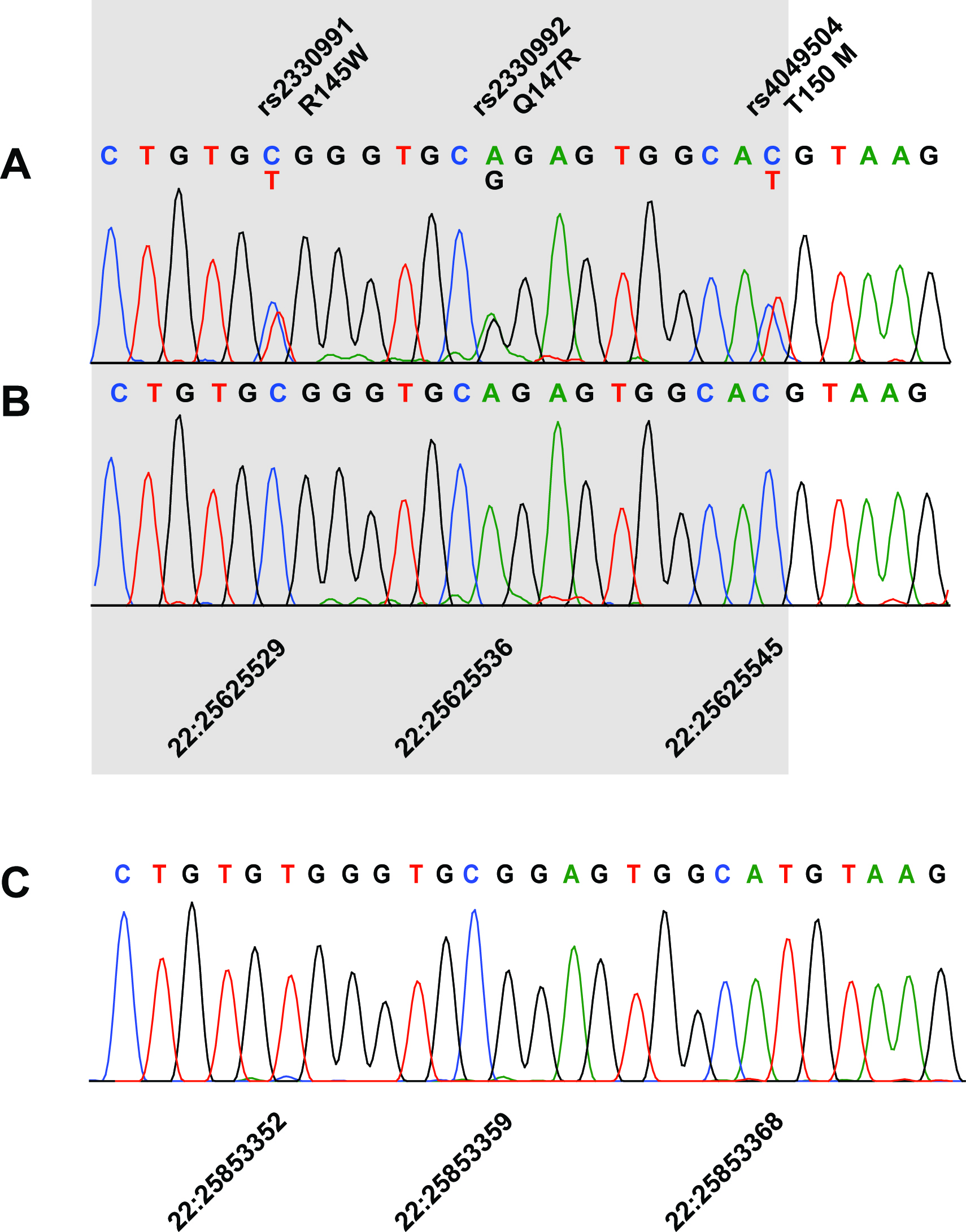 members are heterozygous for all three nonsynonymous changes. In C, the corresponding region of the pseudogene in individual VII:13 is shown for comparison. Chromosome 22 positions are reported