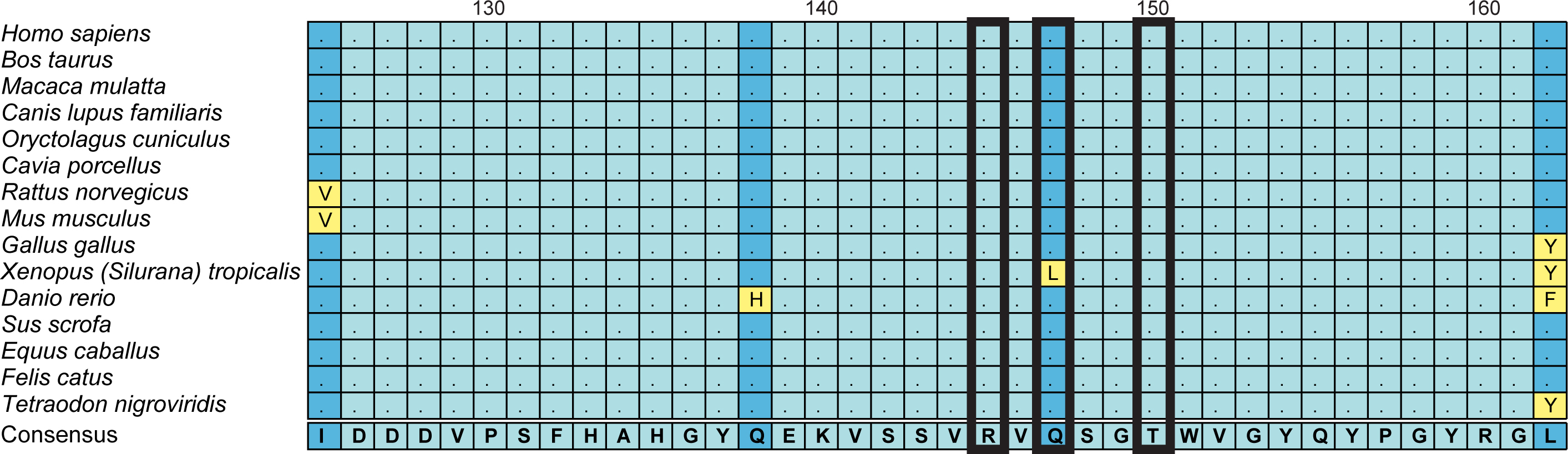 show 100% sequence identity in all species, the darker blue boxes show the consensus sequence, and the yellow boxes show mismatches.