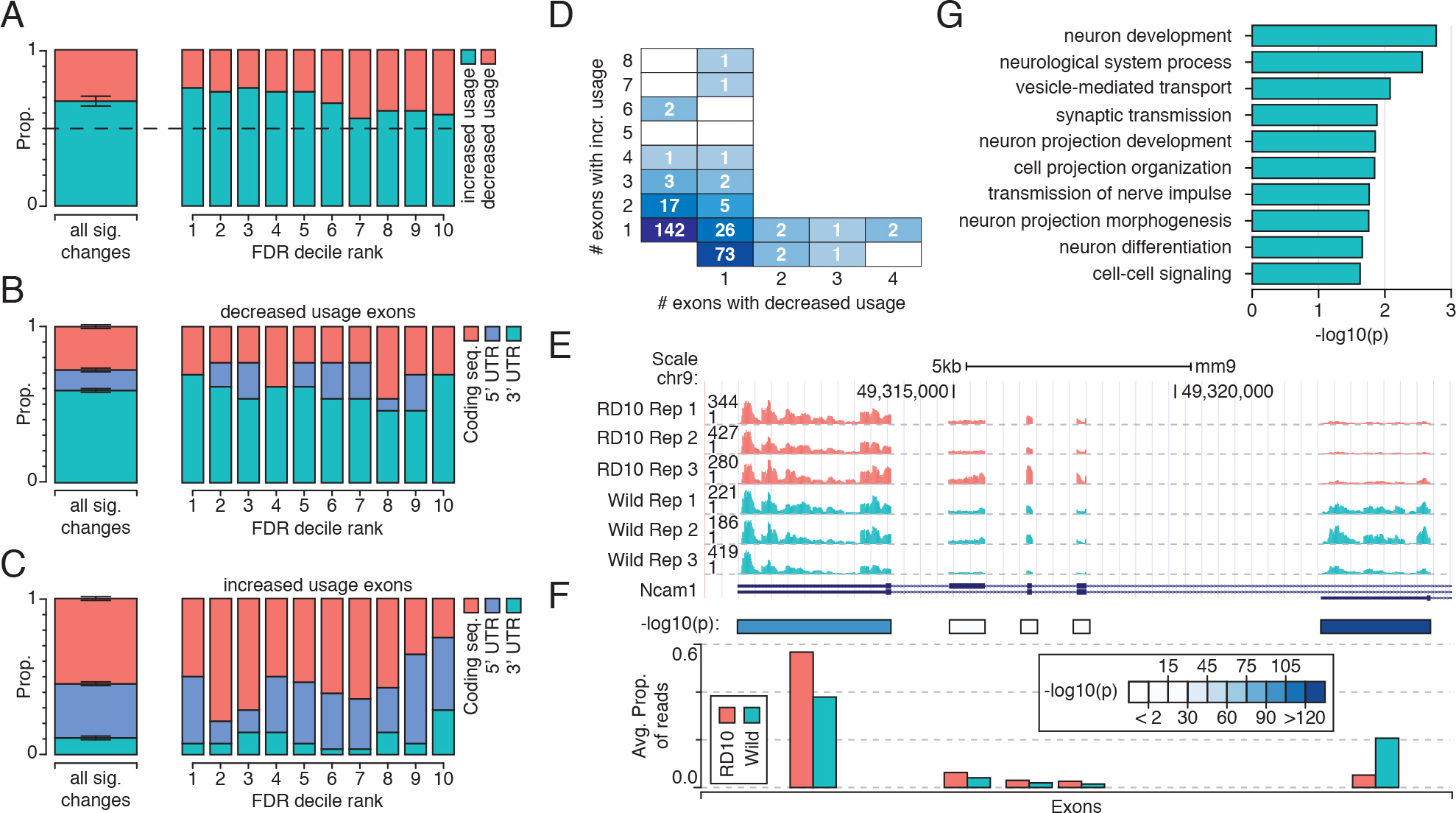 showing decreased relative inclusion (x-axis). E: The UCSC genome browser track shows changes in usage of exons within the Ncam1 transcript. F: Schematic representation of the data from panel E, showing the average proportion of reads falling within each exon and the corrected p value from a Fisher’s exact test. G: Gene Ontology (GO) terms associated with those genes that exhibit changes in splicing between the control and the rd10 samples.