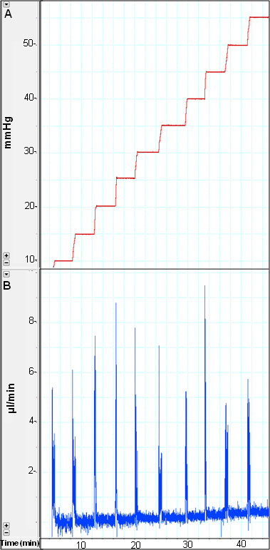 Figure 2. Example of pressure and flow rate traces for constant-pressure perfusion at pressures of 10–55 mmHg. A: Pressure (y-axis; scale 5 mmHg per square) versus time (x-axis; scale 2 min per square); B: flow rate (y-axis; scale 1 µl/min per square) versus time (x-axis). Spikes in the flow trace reflected a momentary increase in flow rate as the pump sped up. Flow rates then automatically