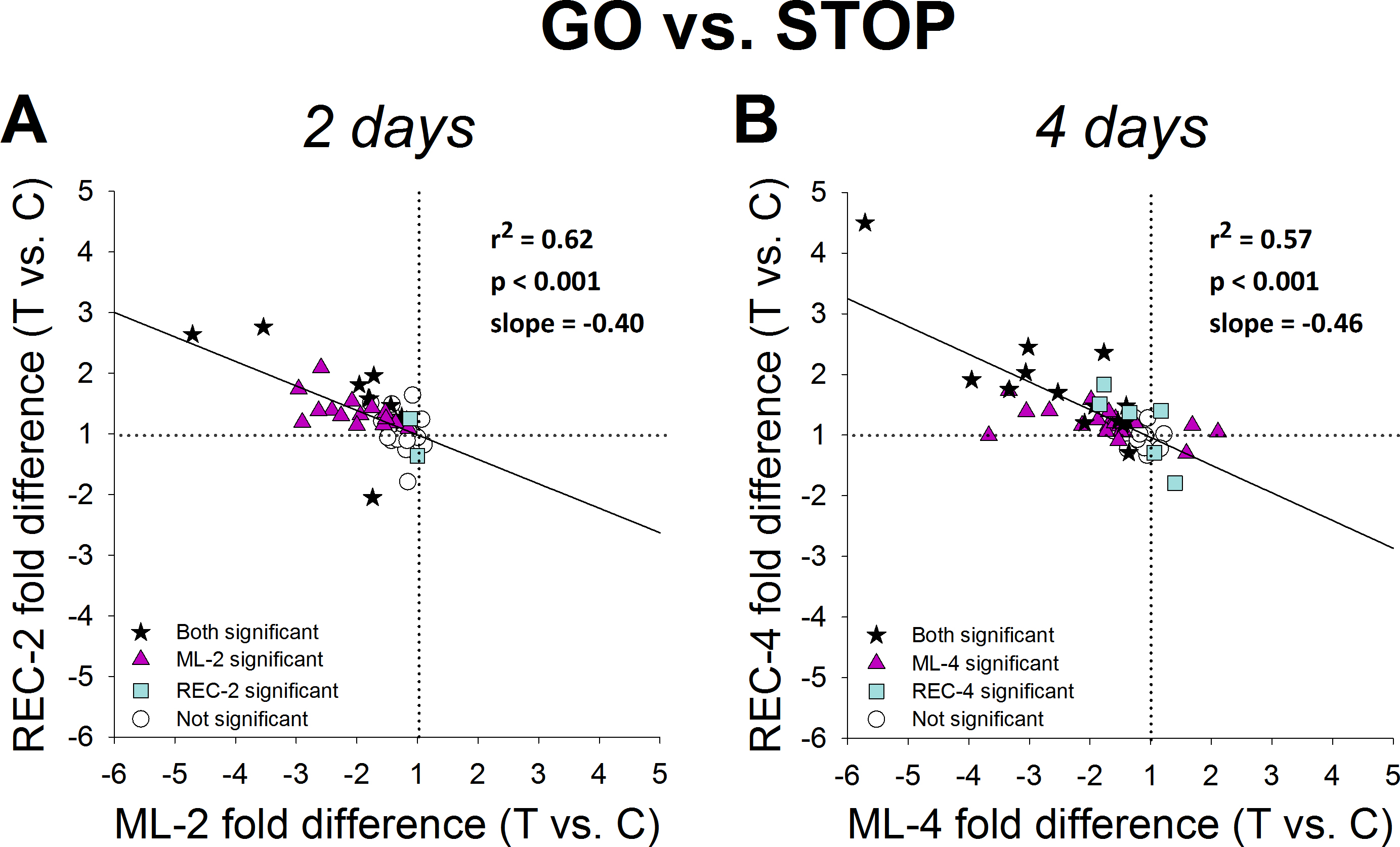 fold differences for both treatments; triangles represent significant fold differences only for ML; squares represent significant