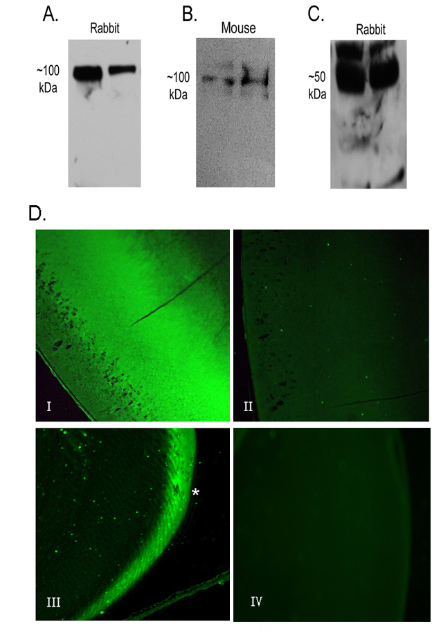 and 28-day-old mouse lenses. A: Immunoblot detection of about 100 kDa PSD-95 in two individual rabbit lens samples. B: Detection of PSD-95 in two mouse lens samples of four lenses. C: Detection of about 50 kDa PTBP2 (nPTB) in rabbit lens. D: In situ detection of PTBP2 in rabbit and mouse lens. Photos show peripheral lens fibers at the lens border: I) indirect