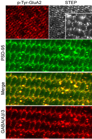 Figure 3. Fluorescent antibody detection of p-Tyr-GluA2, STEP Tyr-phosphatase, PSD-95, and GABA(A)β3 receptor subunits in an approximately