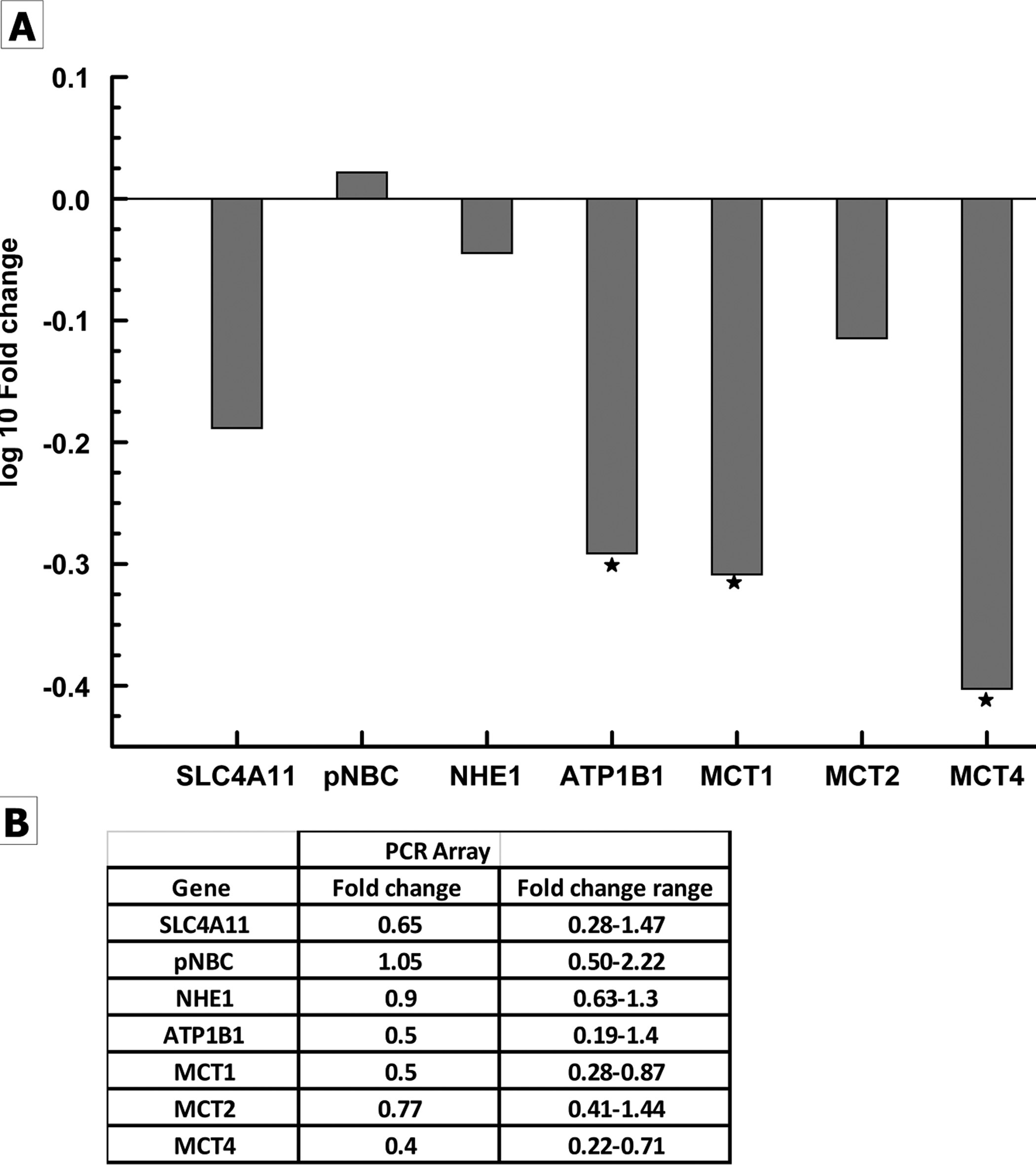 the transporters that had a significant change (p<0.05). B: The fold change for each ion transporter along with the fold change range calculated using ΔΔCt standard deviation.