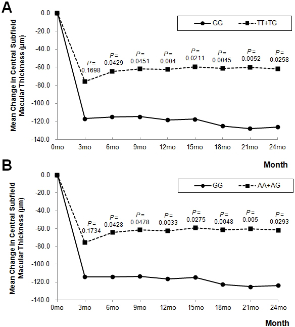 Figure 2. Mean change in central subfield macular thickness during 24-month follow-up according to the 10q26 locus polymorphisms (