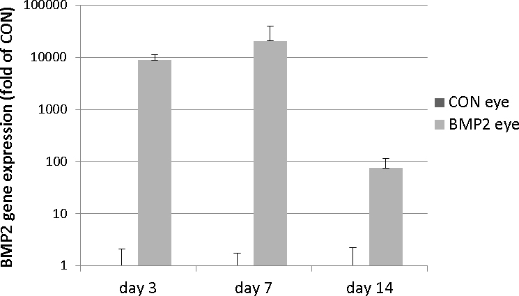 control eyes were dissected, and the total RNAs were isolated. The data show BMP2 gene expression levels with quantitative real-time PCR normalized to the mouse β-actin mRNA. The data represent mean ± SD,