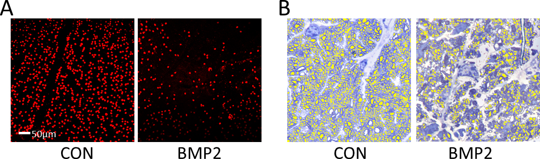 G (IgG) and imaged with epifluorescence microscopy. B: The morphology of the myelinated axons (toluidine blue stained) of mice 36 days after intracameral transduction with BMP2.