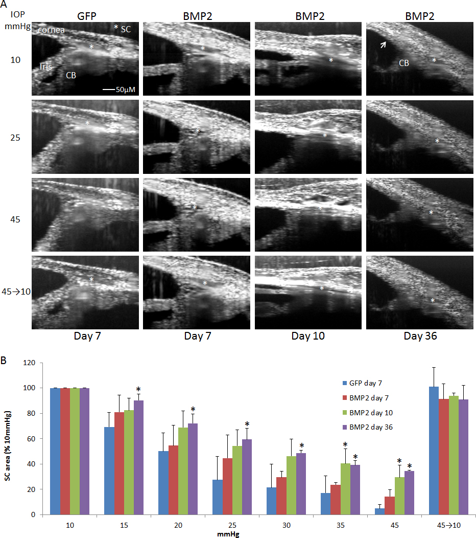 Figure 6. OCT imaging of conventional outflow tissues overexpressing BMP2 or GFP challenged with IOP gradients. After Ad.cmv.BMP2 or