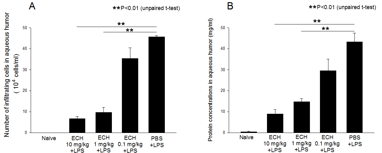 Figure 2. Effects of echinochrome (10, 1, and 0.1 mg/kg) on A: cellular infiltration and B: protein concentration in aqueous humor collected 24 h after lipopolysaccharide (LPS) treatment are shown. Data are presented