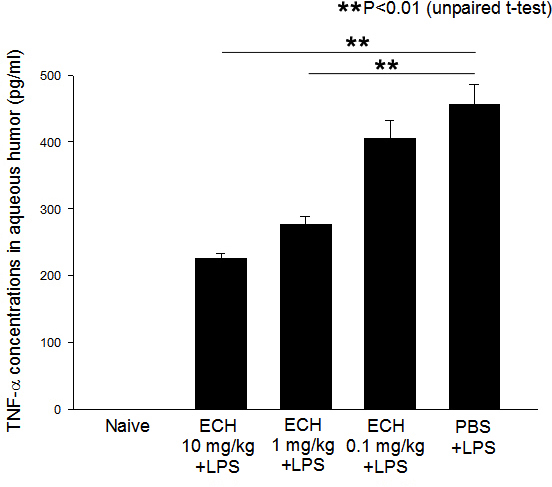 Figure 3. Effects of echinochrome (10, 1, and 0.1 mg/kg) on tumor necrosis factor-α (TNF-α) in aqueous humor collected 24 h after lipopolysaccharide