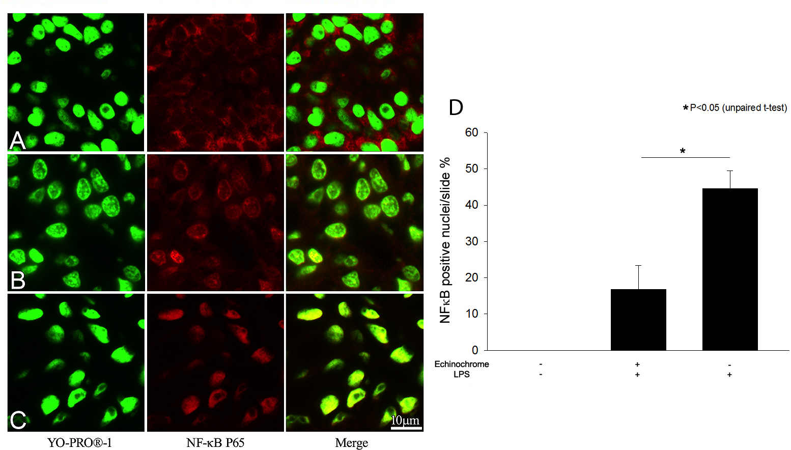 (SEM; n=4). *Amount of NFκB nuclear colocalization was significantly lower in echinochrome treated group than untreated EIU