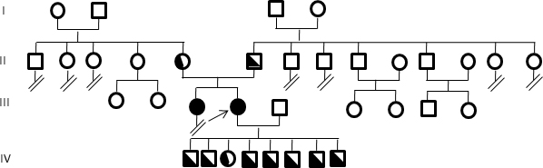 Figure 1. Pedigree of a family with two sisters with USH2. The patients carried in the USH2A gene the single sequence variant c.4144T>C (p.Trp1382Arg), which was first supposed to be present in homozygosis. Because