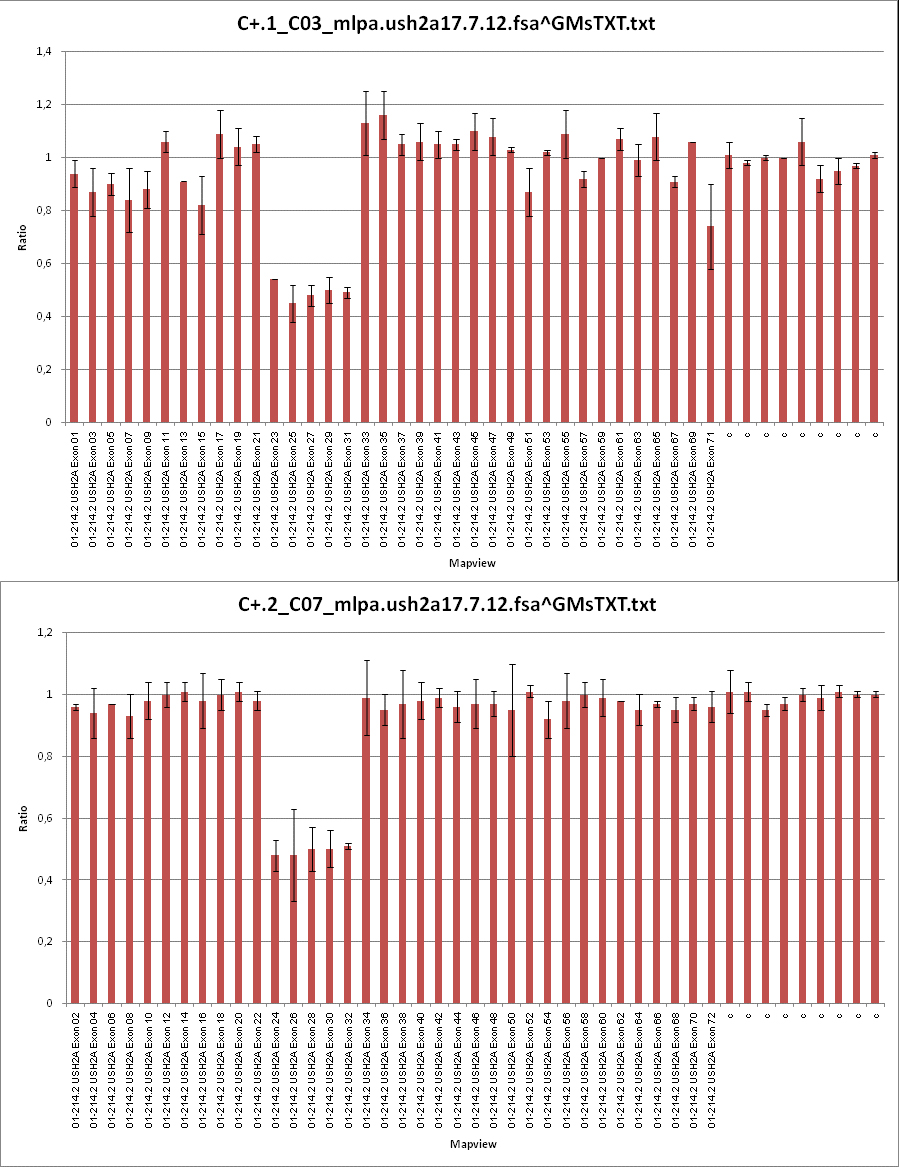 plate files for the MLPA analysis. Results showed that probe signals from exons 23 to 32 of the USH2A gene (see the x-axis) were significantly decreased (ratio on the y-axis is about 0.5) indicating the presence of a deletion