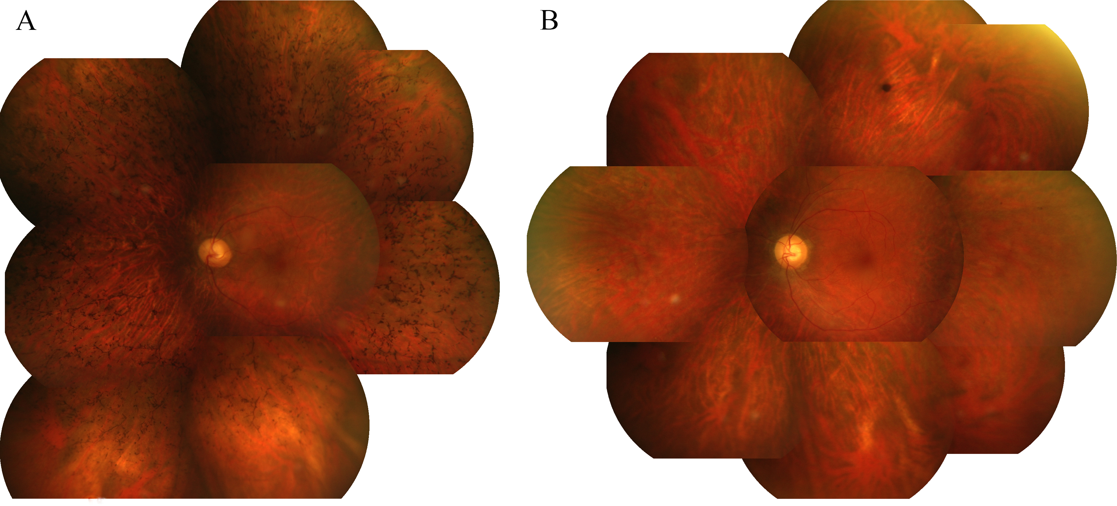 Figure 3. Fundus pictures of two brothers of the same family, who carry the same genotype (c.2299del (p.Glu767Serfs*21) USH2A variant on one allele and c.13130C>A (p.Ser4377*) USH2A on the other allele). One patient (A, patient GF) shows a typical form of retinitis pigmentosa while the other one (B, patient GS) presents with an atypical fundus appearance with mild retinal dystrophy and rare pigment deposits. In the second
