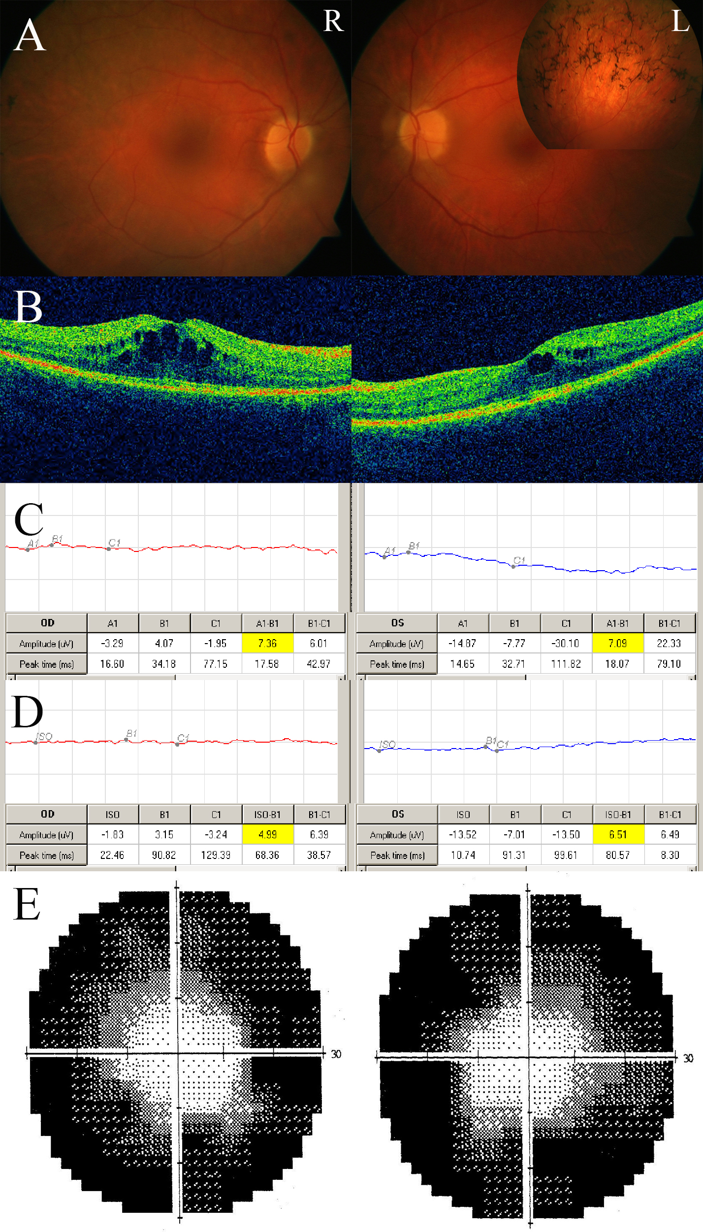 Figure 4. Clinical case of a patient carrying an USH2A missense variants (c.1434G>C (p.Glu478Asp), c.7595–2144A>G (p.Lys2532Thrfs*56)) on one allele and an USH2A exon deletion (Del EX22) on the other allele (patient BL). A: Fundus photographs: typical form of retinitis pigmentosa. B: OCT scans: cystoid macular edema. C: Photopic electrophysiological responses: severely abnormal. D: Scotopic electrophysiological responses: severely abnormal. E: Humphrey visual field: concentrically reduced. This patient carrying a monoallelic USH2A deletion presented with the clinical picture of typical retinitis pigmentosa, similar to other cases in our series.