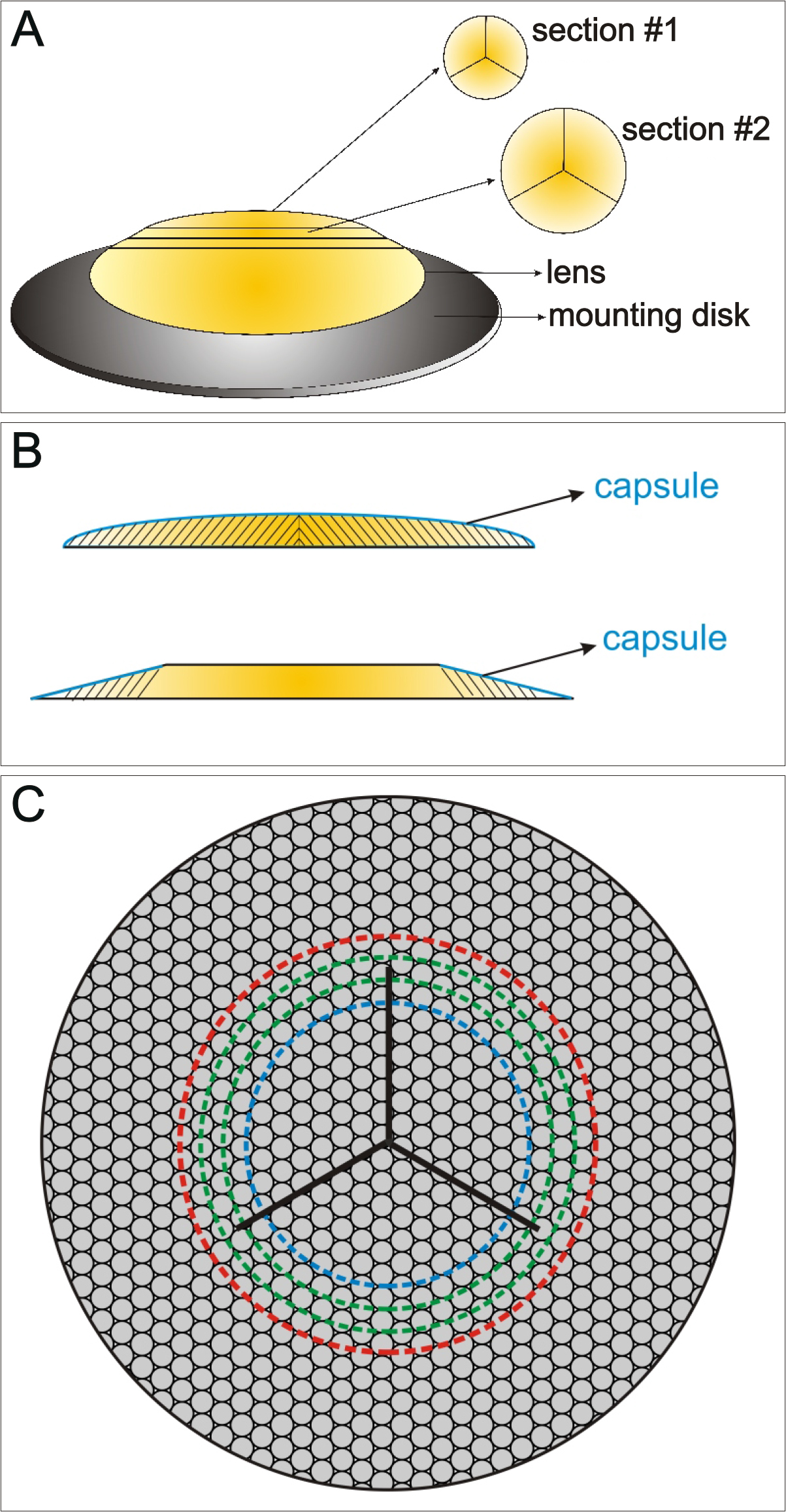 C: Enlarged en face view of the posterior surface of the lens shows basal fiber ends beneath the capsule in the first section