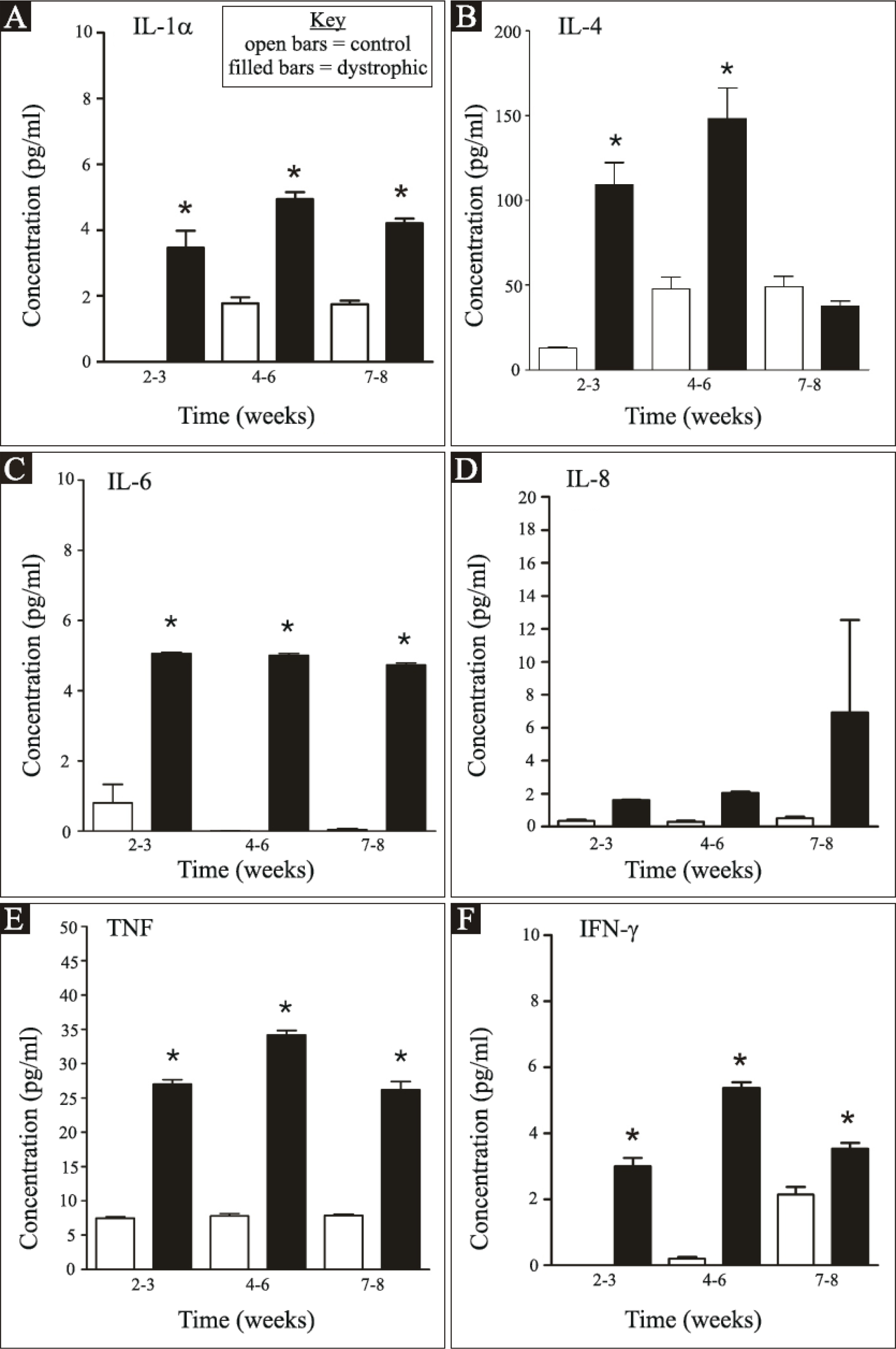control and dystrophic groups (p≤0.05). A: IL-1α, B: IL-4, C: IL-6, D: IL-8, E: TNF, F: IFN-γ.