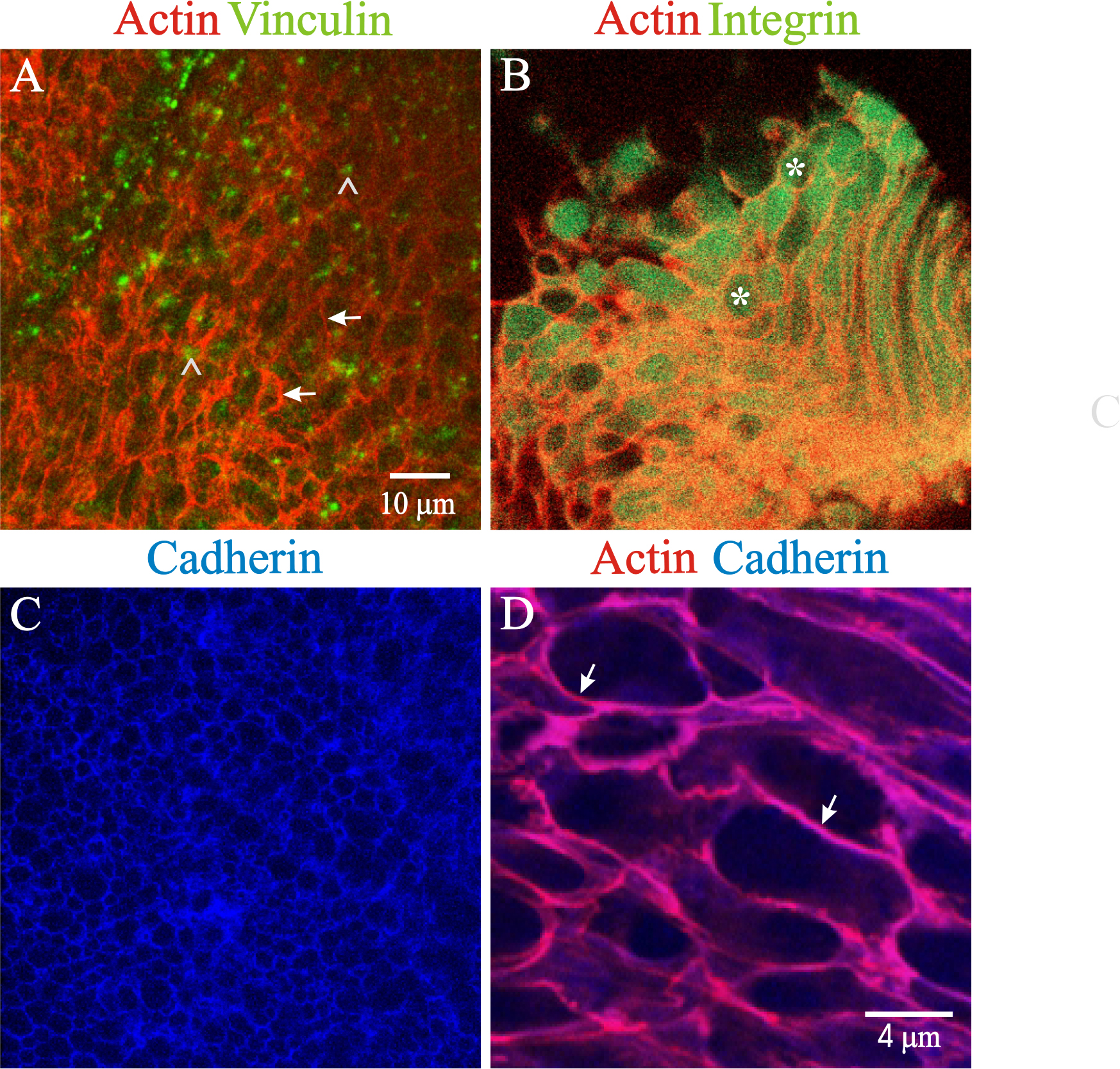 with F-actin, which outlined the fiber ends (arrows). B: A 4-week-old animal. β integrin in the control animals was distributed as a plaque within fiber ends (asterisks). C: A 3-week-old animal. Immunofluorescence for cadherin was present at the BMC periphery. Panels A–C are at the same magnification. D: A 6-week-old animal. Double labeling for F-actin and cadherin demonstrated that both components were localized at the periphery