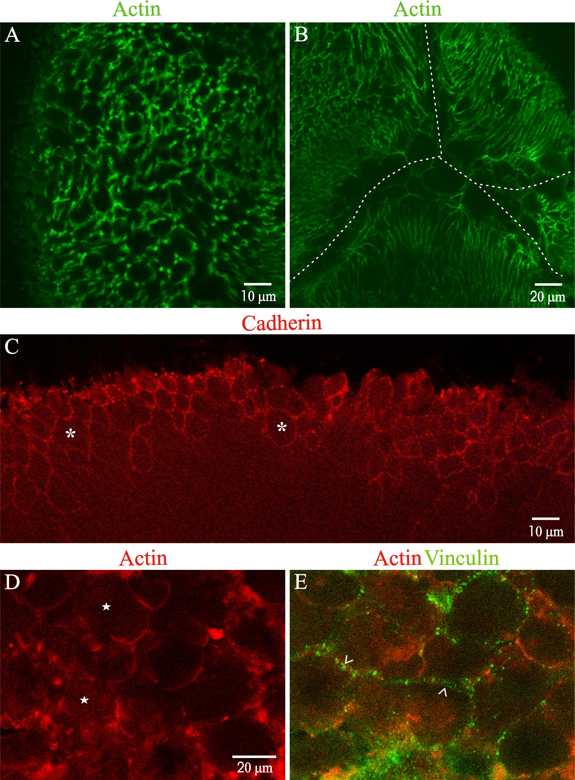 fluorescence for vinculin around the periphery (arrowheads). Panels D and E are at the same magnification.