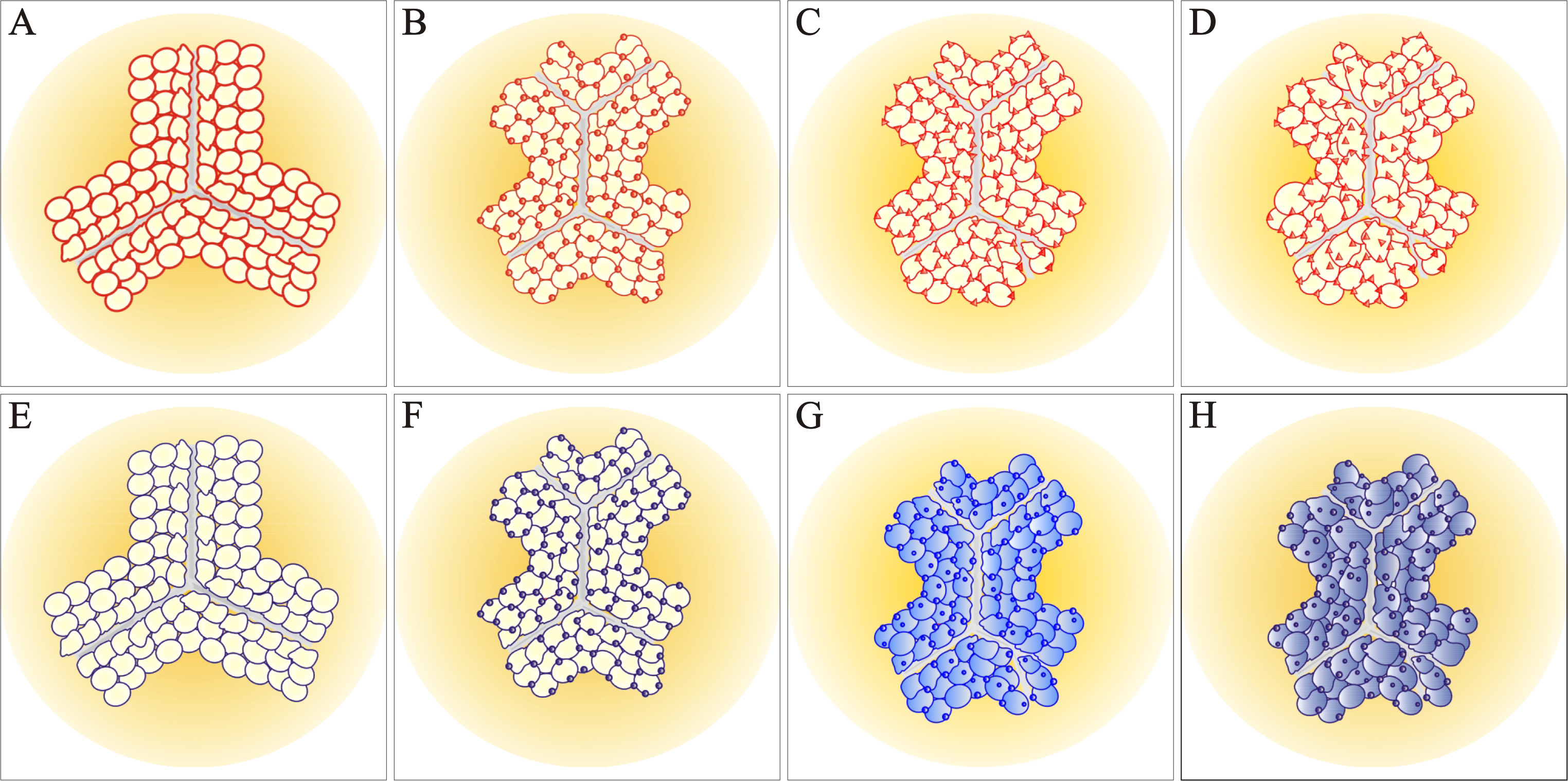 Figure 7. Diagram summarizing the distribution of F-actin (shown in red; A-D) and cadherin (shown in blue; E-H) in the BMC of migrating fiber ends in RCS/Lav (dystrophic) rats. A, E: At 2 weeks old; B, F: at 4 weeks old; C, G: at 6 weeks old; D, H: at 8 weeks old. F-actin was initially distributed around the periphery of the BMC but by 4 weeks postnatal was altered such