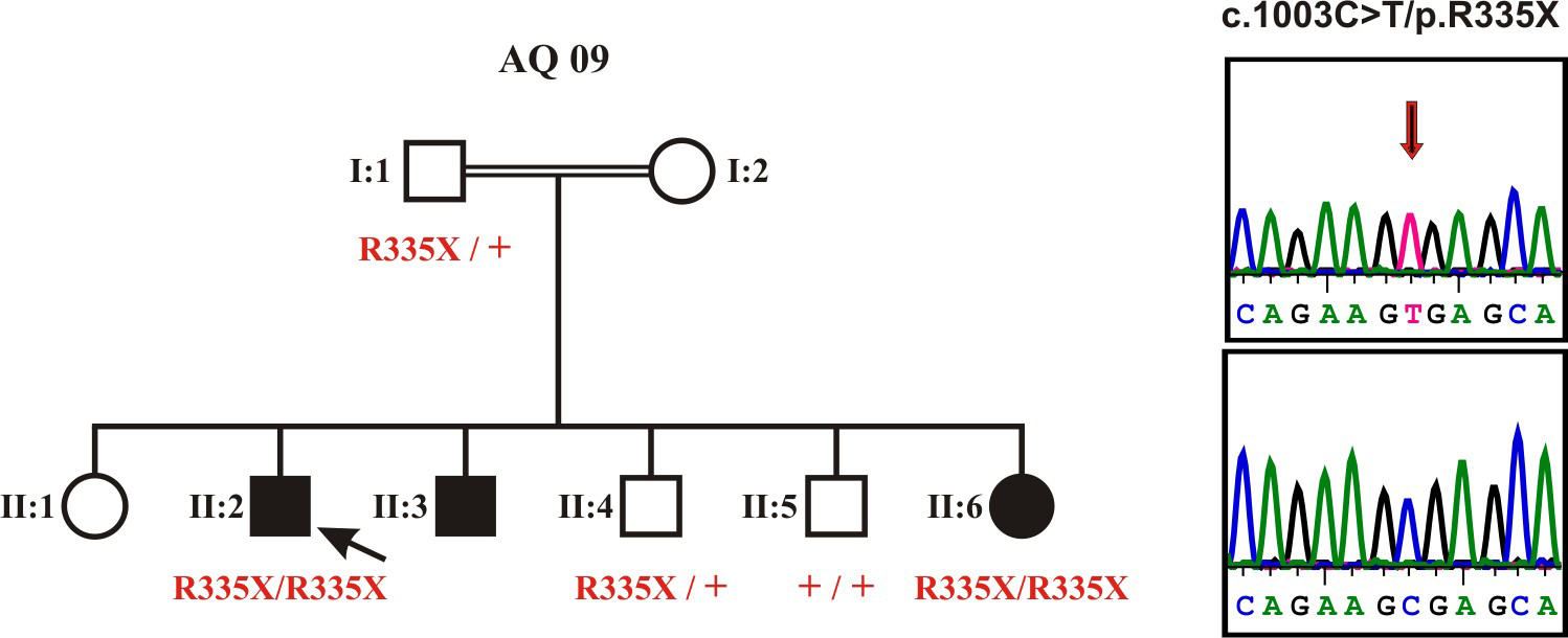 Figure 2. Pedigree and genetic findings. The index patient and his youngest sister show a homozygous nonsense mutation, c.1003C>T/p.R335X,