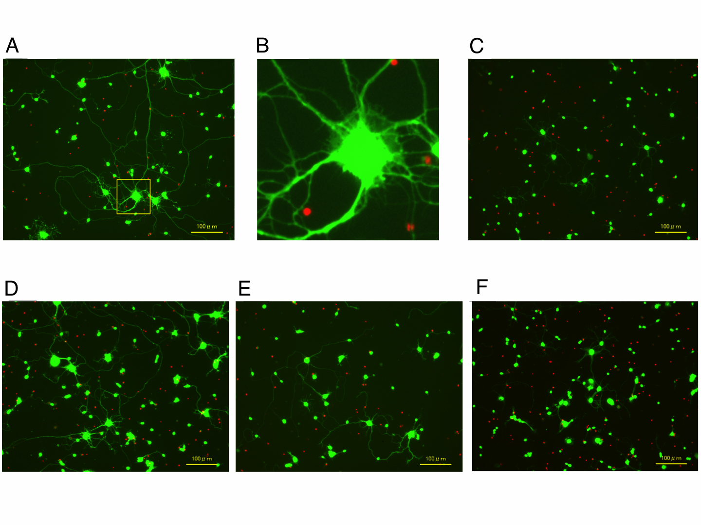 green with calcein-AM and dead cells were red by ethidium homodimer-1. A: Non-treated control. B: Magnified figure of A.C: 25 μM glutamate only. D: 25 μM glutamate + 100 nM astaxanthin. E: 25 μM glutamate + 10 nM astaxanthin. F: 25 μM glutamate + 1 nM astaxanthin.