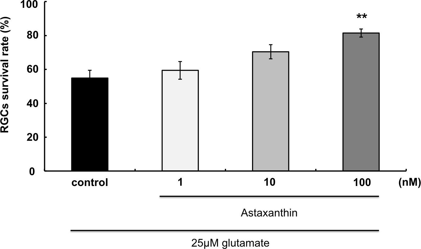 ganglion cell (RGC) survival rate compared to glutamate 25 μM (black column, as control). ** indicate p<0.01, Dunnett’s test;