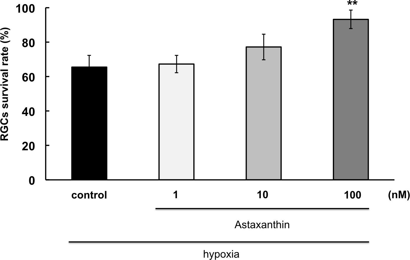 ganglion cell (RGC) survival rate compared to hypoxia only (control). p<0.01, Dunnett’s test; n=12. Error bar indicates standard