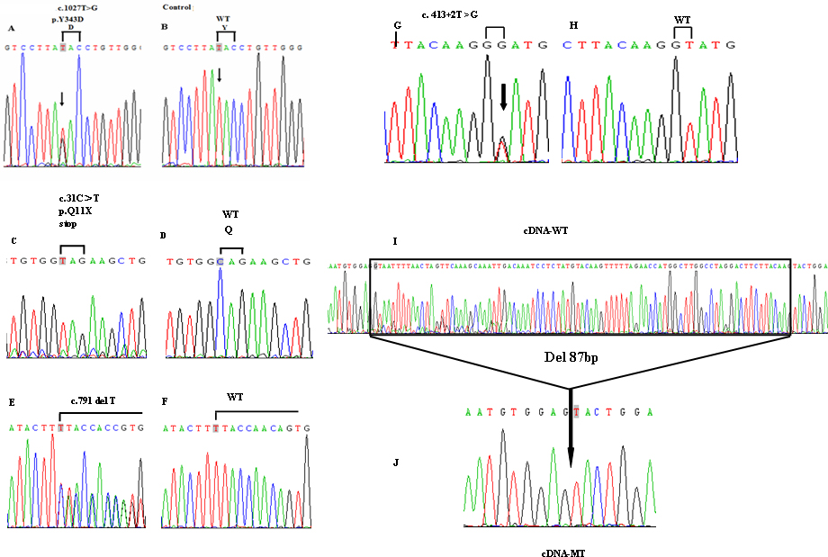 Figure 4. Genomic DNA and cDNA of the CYP4V2 gene in four novel mutations. A: The heterozygous mutant single base-pair change (c.1027T>G,p.Y343D). B: Control (wild type, WT). C: The homozygous nonsense mutant (p.Q11). D: Control (WT). E: The heterozygous change (c.791del T). F: Control (WT). G: DNA-MT of the heterozygous splice change (c.413+2T>G). H: Control (WT). I: cDNA sequence, from the sense primer, for the control (WT). J: The cDNA of the heterozygous splice change (c.413+2T>G). The deletion is indicated with an arrow and black frame.