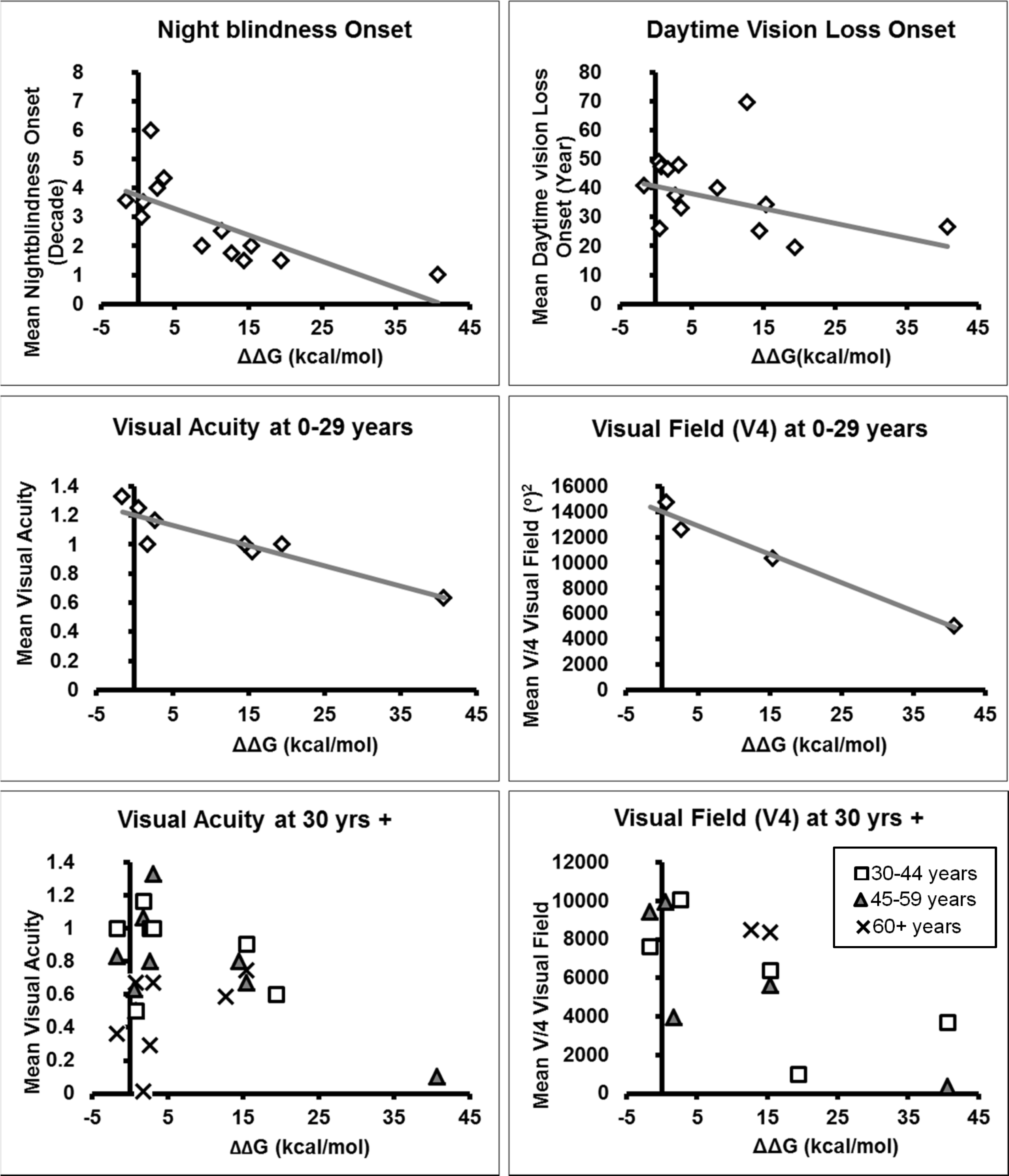 ∆∆G and the severity of visual function in the youngest cohort (0–29 years, center), but in the older cohorts, other factors