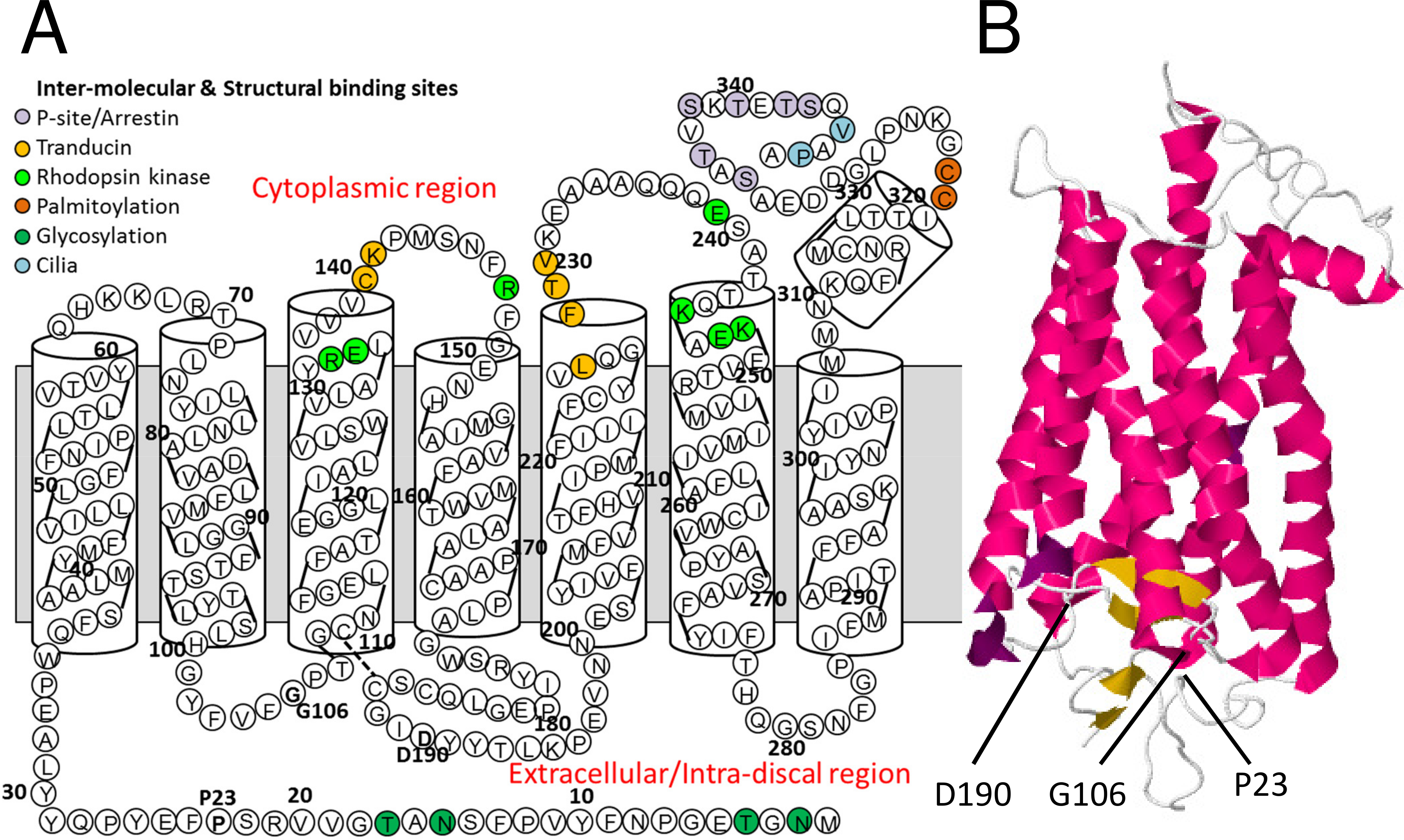 B: The structure of rhodopsin showing the relative positions of the three residues mutagenized for in vitro analysis of surface