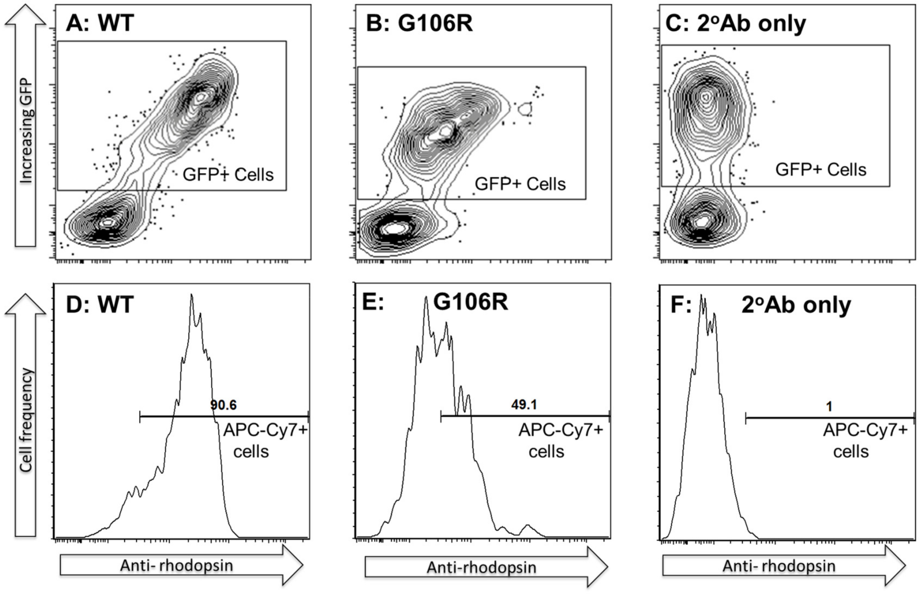 (APC-Cy7). Here are shown wild-type transfections (A) and transfections of the G106R variant (B). A control sample treated with the secondary detection antibody alone (C) is shown for comparison of APC-Cy7 intensities. Two discrete populations can be seen in each culture, with transfected cells