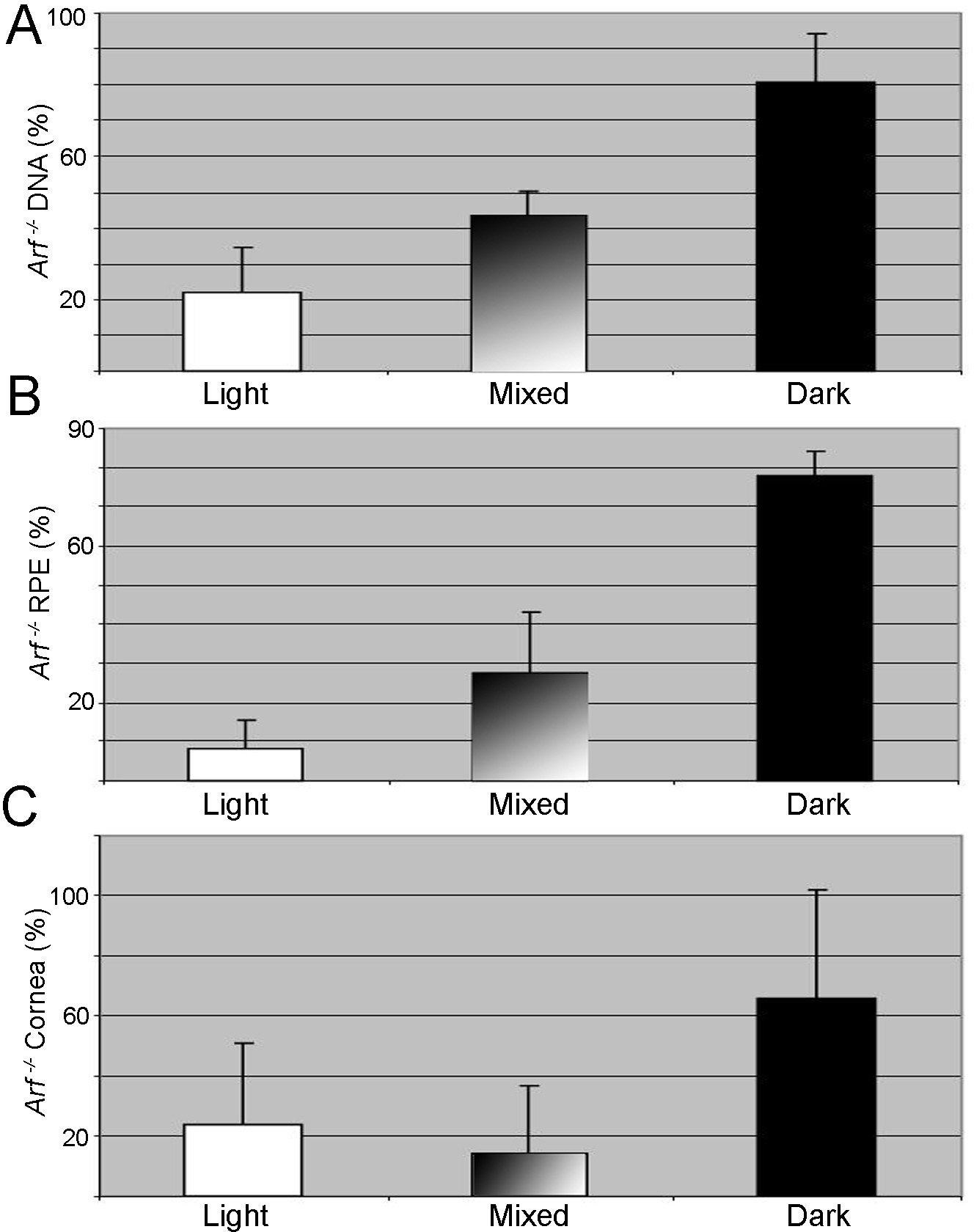 Figure 4. The coat color phenotype correlates with the quantitative measurement of the Arf −/− lineage contribution to chimera. Charts display the average Arf −/− content in the tail-derived DNA (A), retinal pigment epithelium (RPE) (B), and cornea (C) in chimeric animals with light, mixed, and dark coats as indicated; error bars indicate standard deviation. The non-parametric