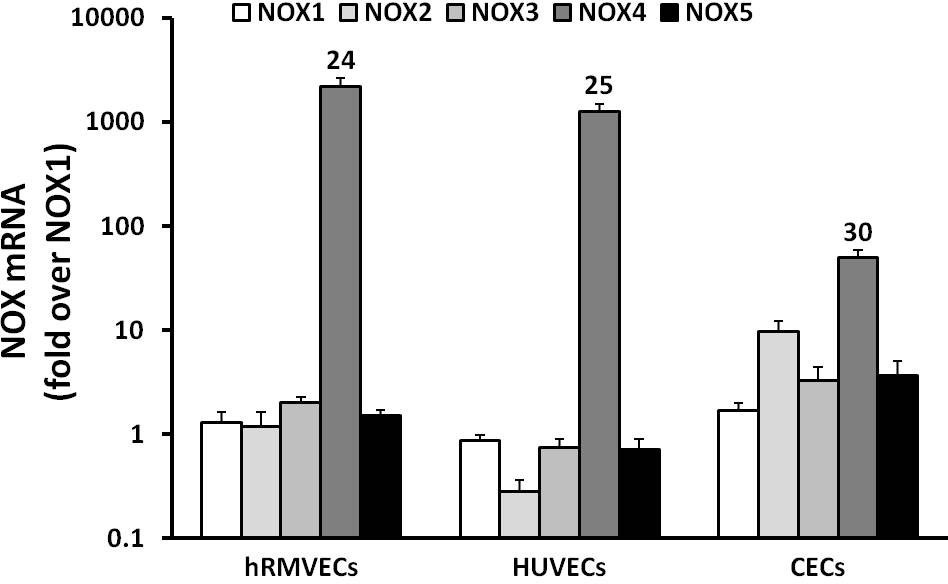 Figure 1. Expression of NOX4 in cultured vascular endothelial cells. Quantitative Real-time PCR of NOX isoforms was measured in human