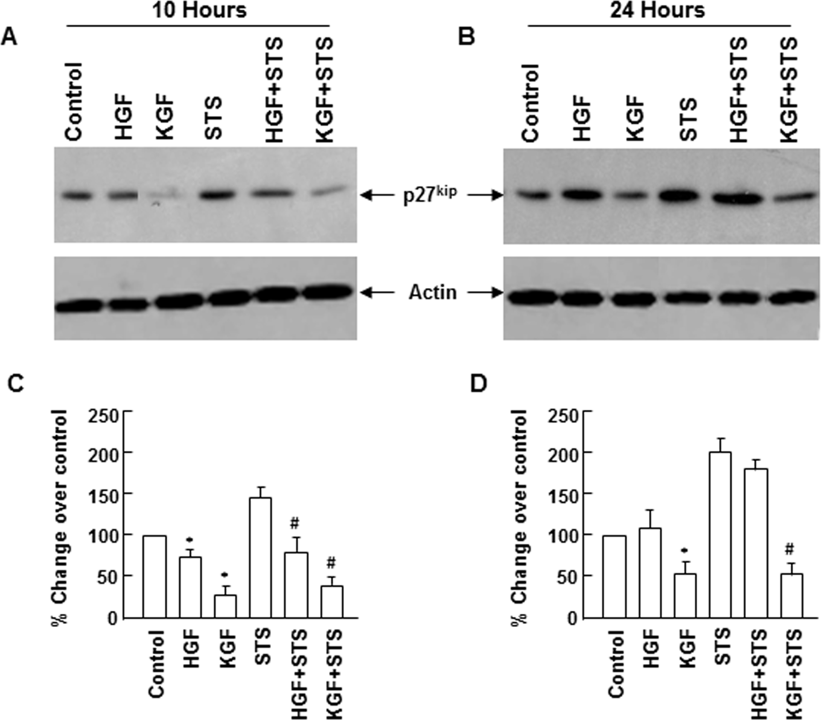 Figure 4. Downregulation of p27kip expression by hepatocyte growth factor (HGF) and keratinocyte growth factor (KGF) during apoptosis. Rabbit corneal primary