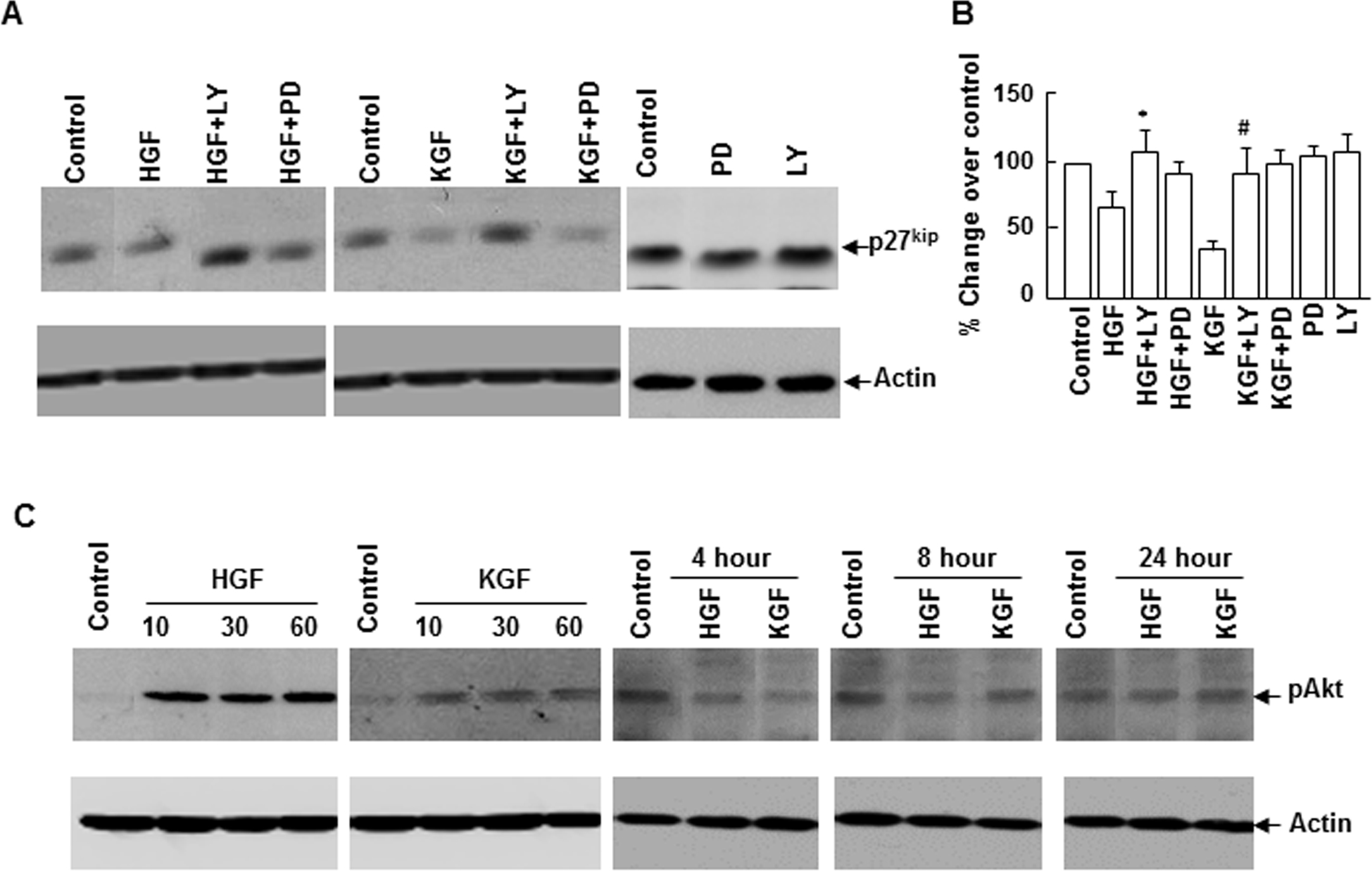 of p27kip levels is presented in B. Data shown are mean±standard deviation (SD). p<0.05, *HGF versus LY+HGF, #KGF versus LY+KGF.