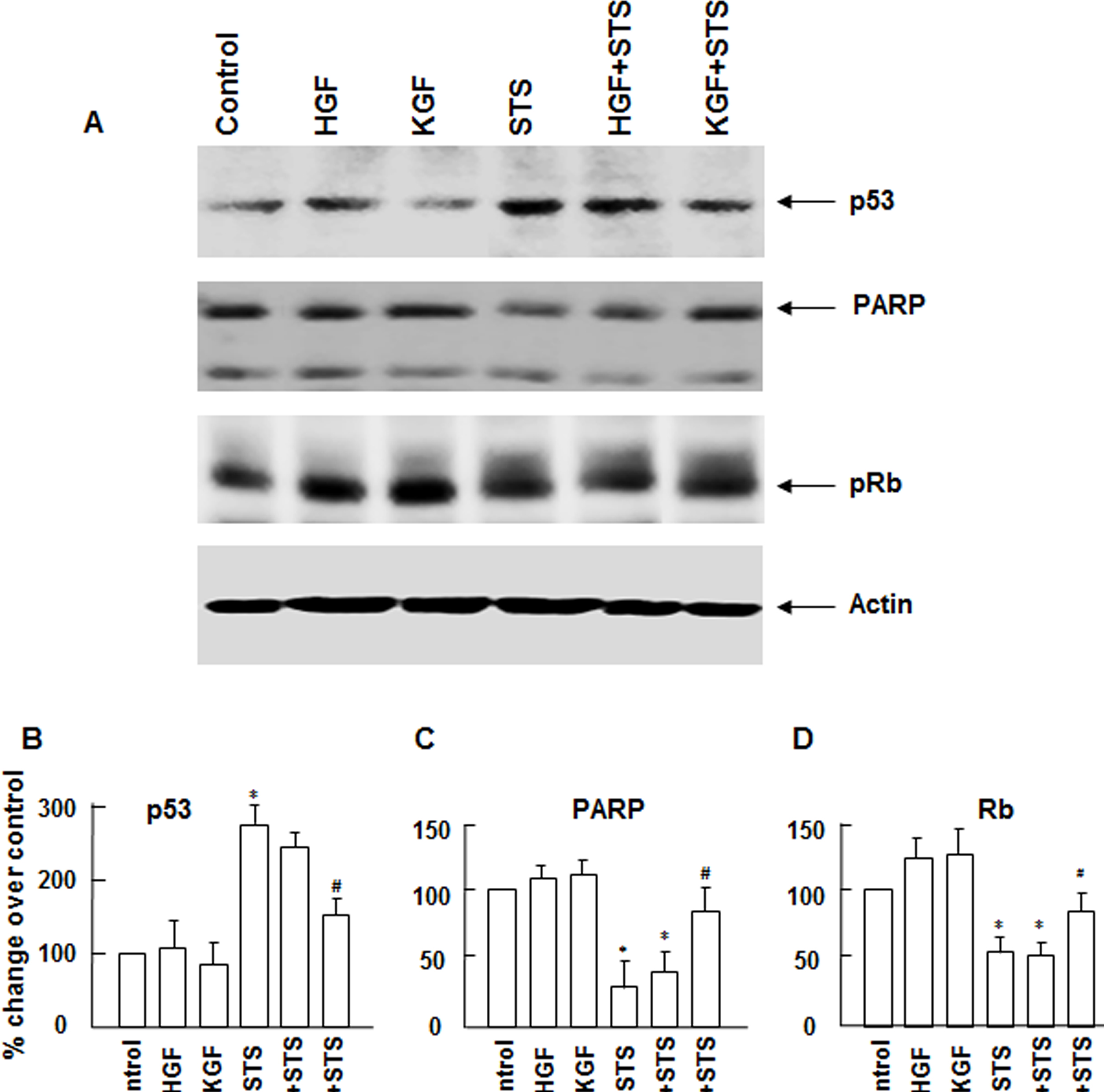 determined with western immunoblotting by using antibodies specific for each protein (A). Experiments were performed two to three times. Quantification of different proteins is shown in bar diagrams (B–D). Data shown are mean±standard deviation (SD). *p<0.05, control versus STS, #p<0.05, STS versus STS+KGF in in (B); *p<0.05, control versus STS or STS+HGF, #p<0.05, STS versus STS+KGF in (C and D).