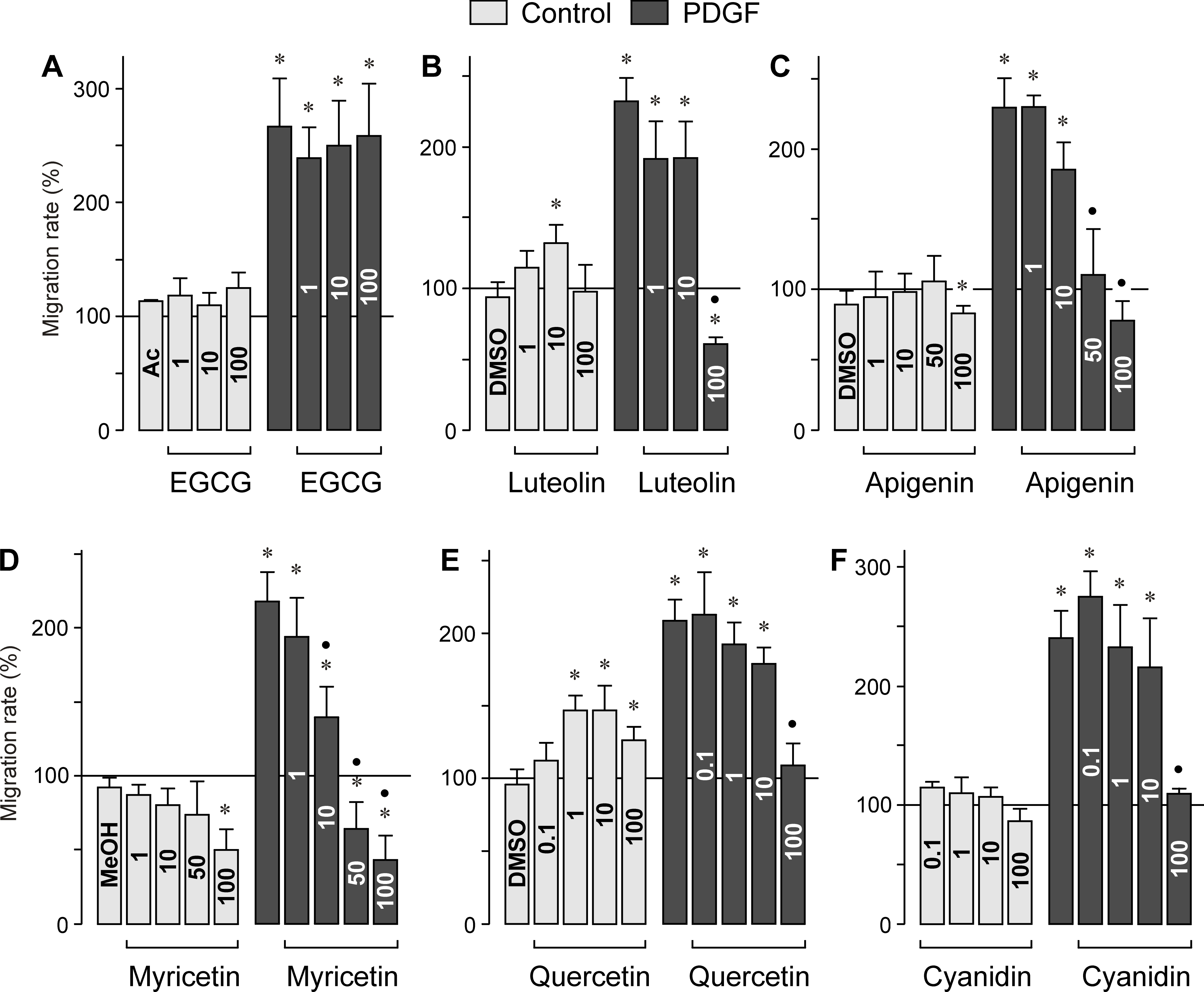 Figure 4. Dose-dependent effects of several vegetable polyphenols on the chemotaxis of retinal pigment epithelial cells. (A) epigallocatechin-3-gallate, (B) luteolin, (C) apigenin, (D) myricetin, (E) quercetin, and (F) cyanidin. The effects were determined in the absence (control) and presence of platelet-derived growth factor (PDGF) (10