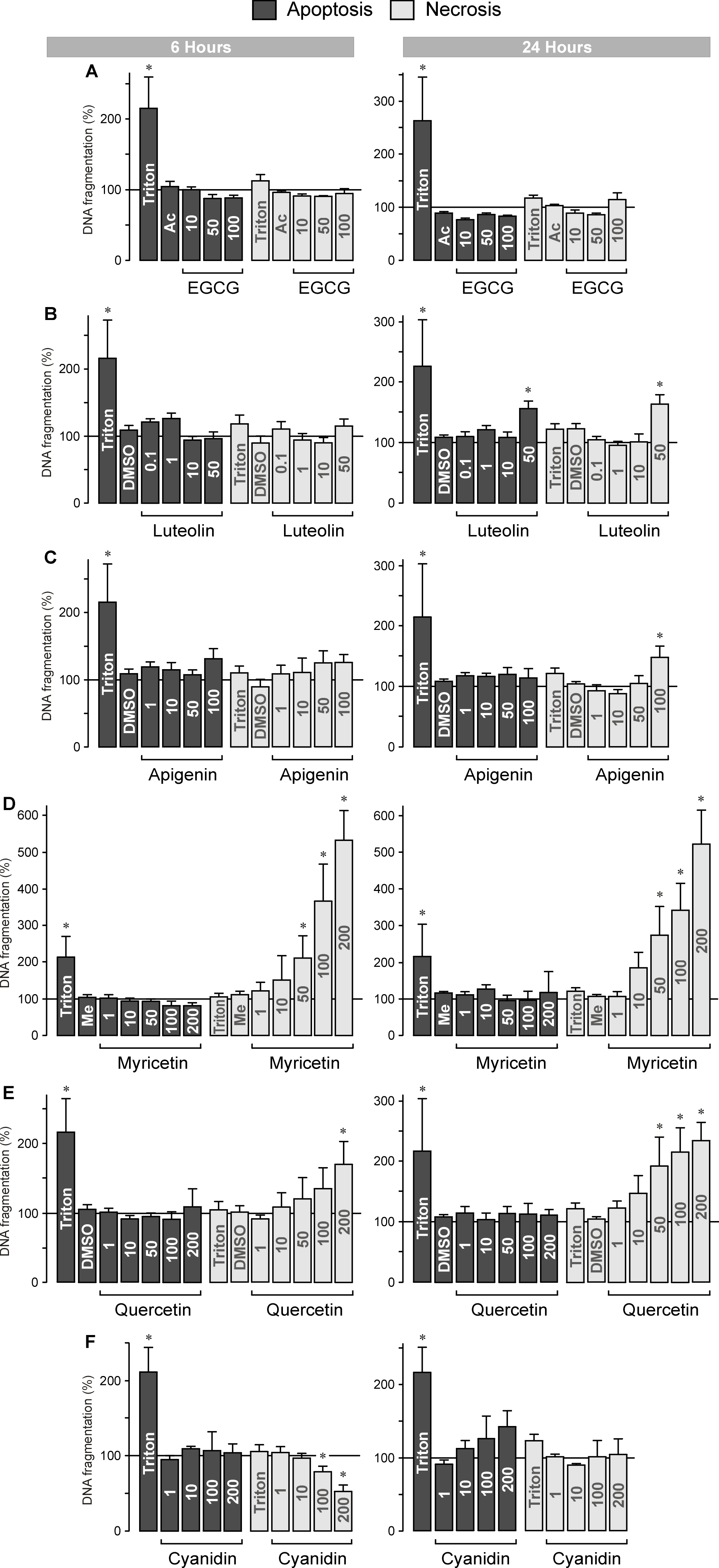 cells. (A) epigallocatechin-3-gallate, (B) luteolin, (C) apigenin, (D) myricetin, (E) quercetin, and (F) cyanidin. The rate of DNA fragmentation was determined in the cell lysates (to determine the level of cellular apoptosis)
