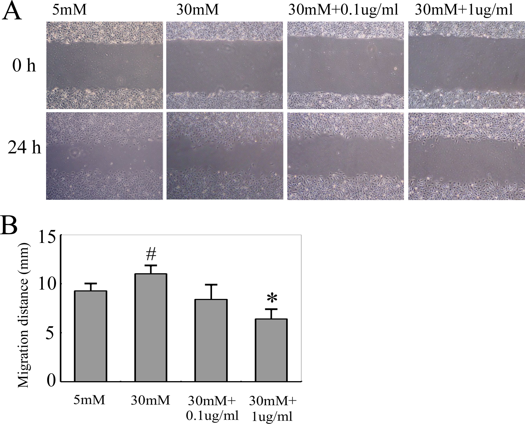 a scratch wound assay. A: After HRECs were wounded using a 200 μl yellow micropipette tip, they were incubated with serum-free media containing high