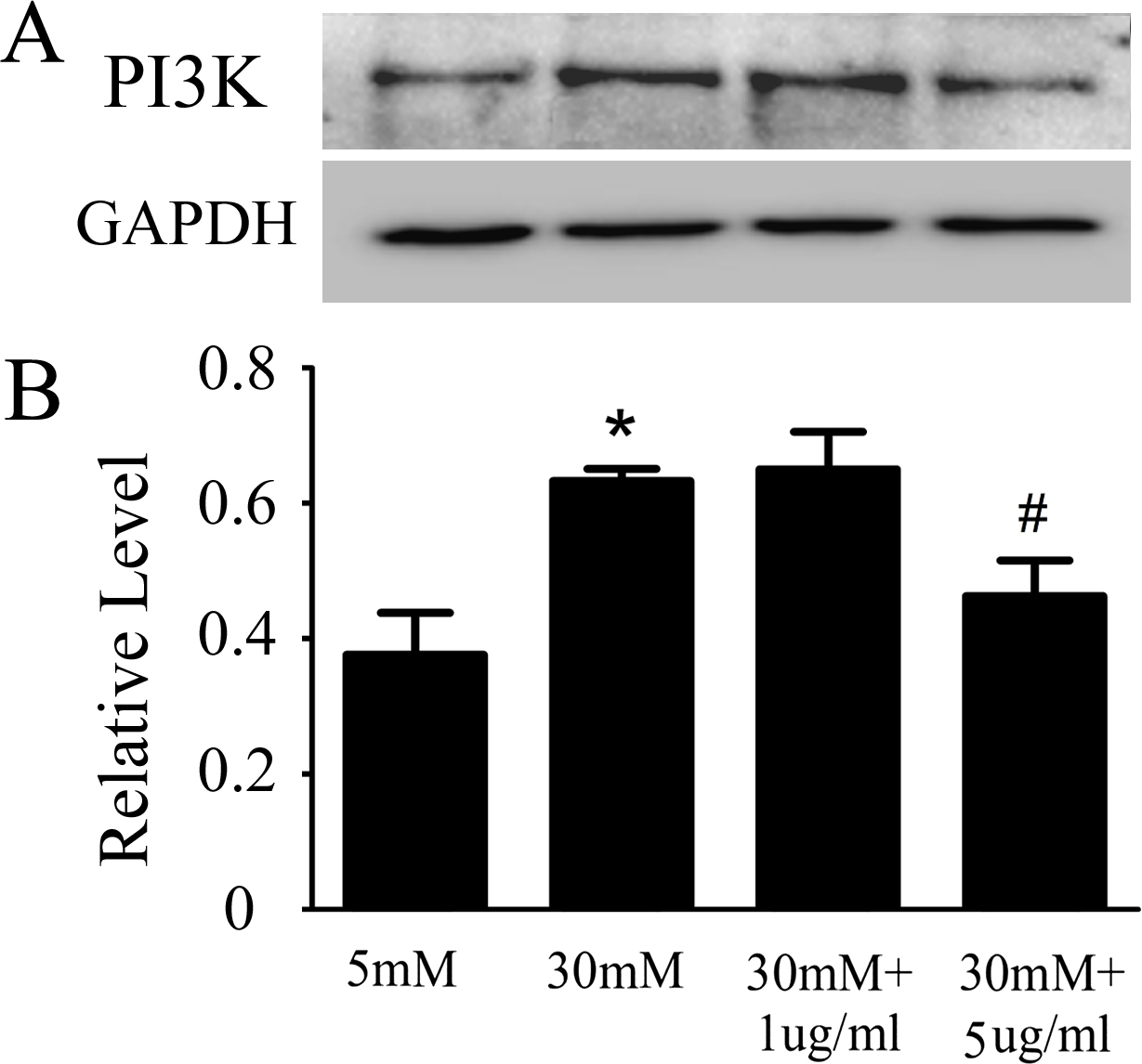 experiments. All values represent Mean±SD (n=3). * p<0.05 versus the 30 mM group. # p<0.05 versus the 5 mM group.