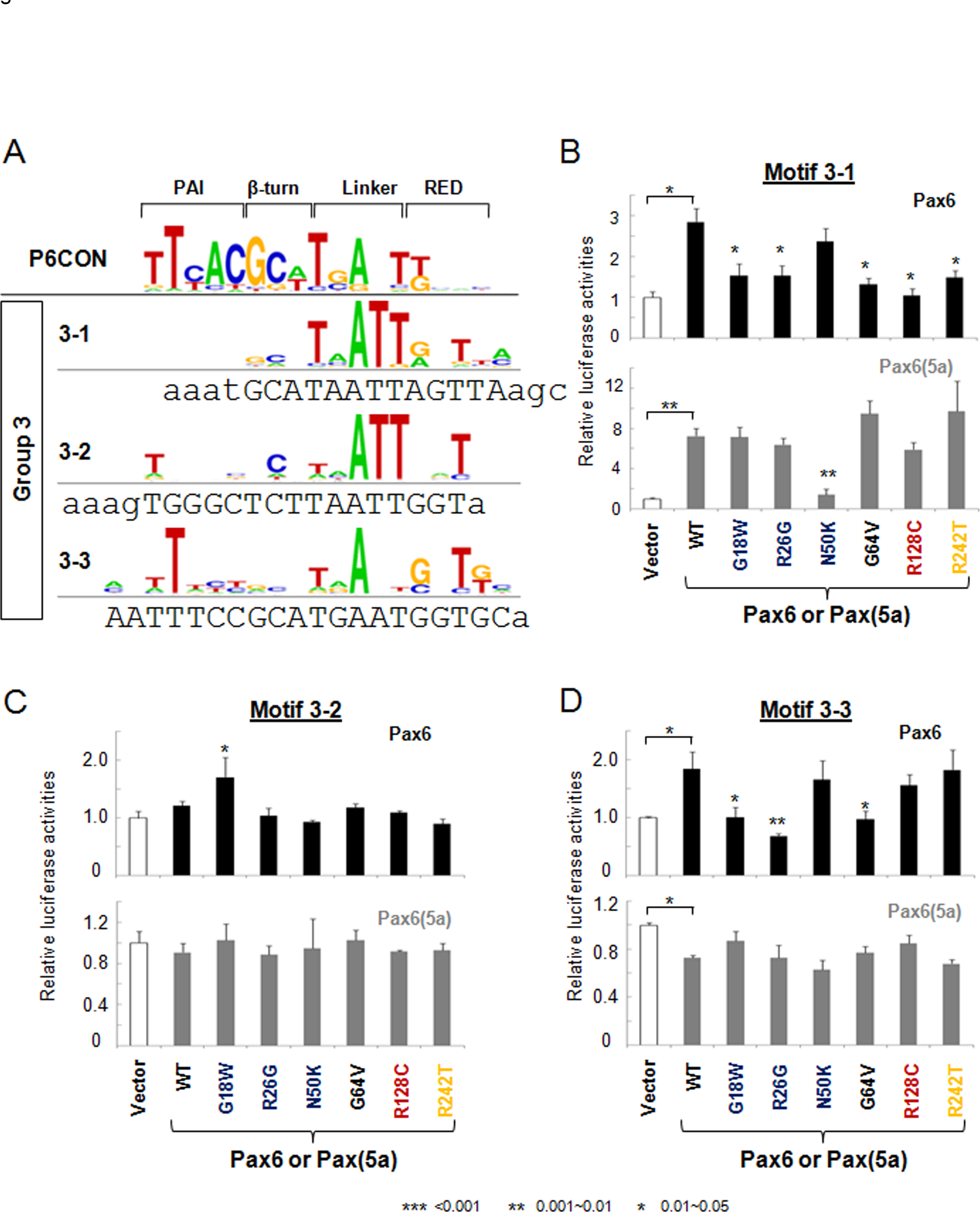 Figure 4. Transcriptional regulation by PAX6 and PAX6(5a) on motif 3–1, 3–2, and 3–3 luciferase reporters. A: Distribution of the nucleotides in Pax6-binding motifs 3–1, 3–2, and 3–3. The DNA sequences for gene synthesis are aligned