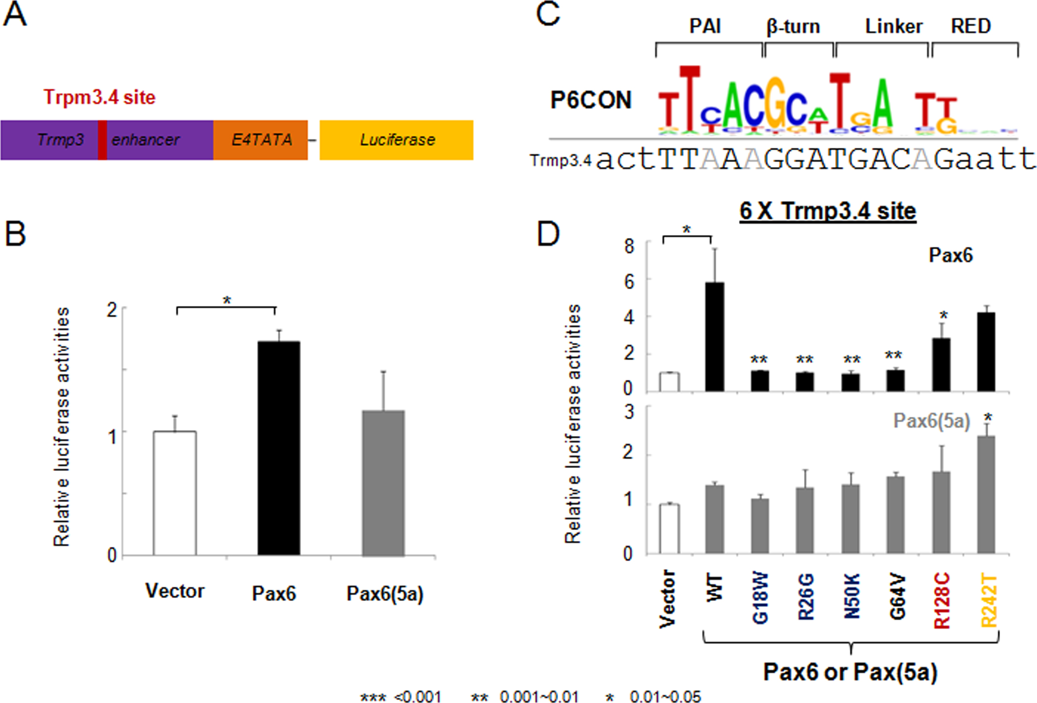 The binding sites and flanking sequences are in upper and lower case, respectively. D: Evaluation of PAX6 (black bars) and PAX6(5a; gray bars) series with the 6xTrpm3.4 luciferase reporter in cotransfected P19