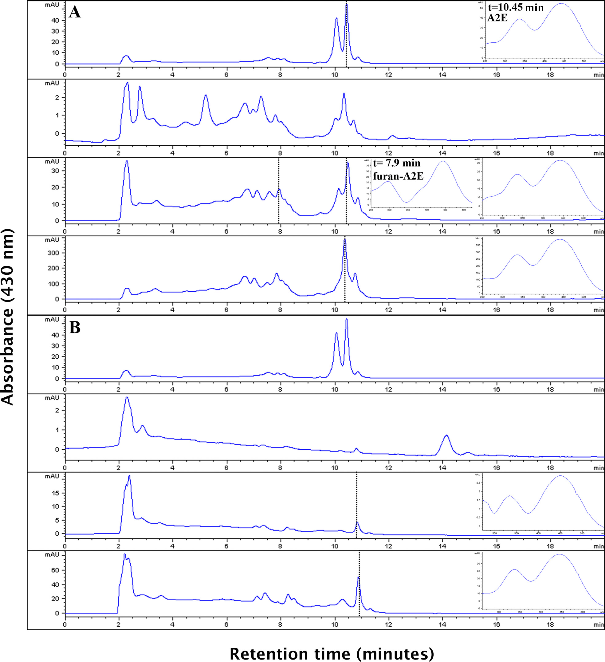 delivered in DMSO. The absorption spectra (250 to 550 nm) of the A2E peak (10.4–10.9 min) are shown (insets) for the 1 µM